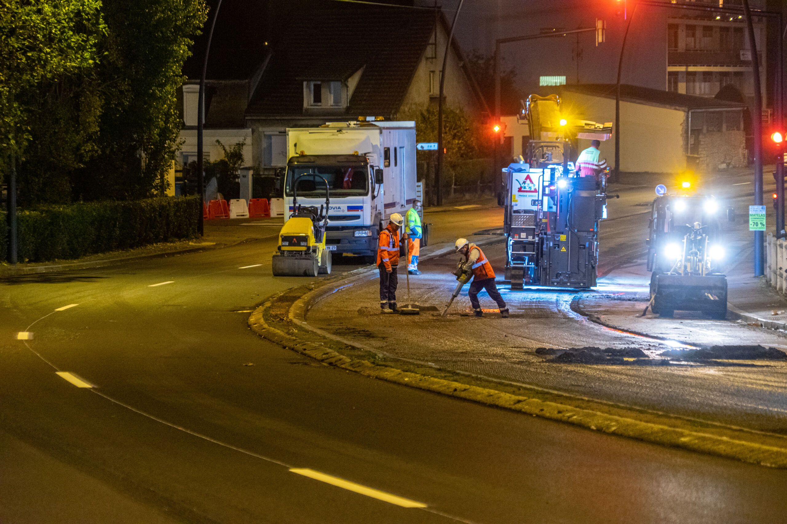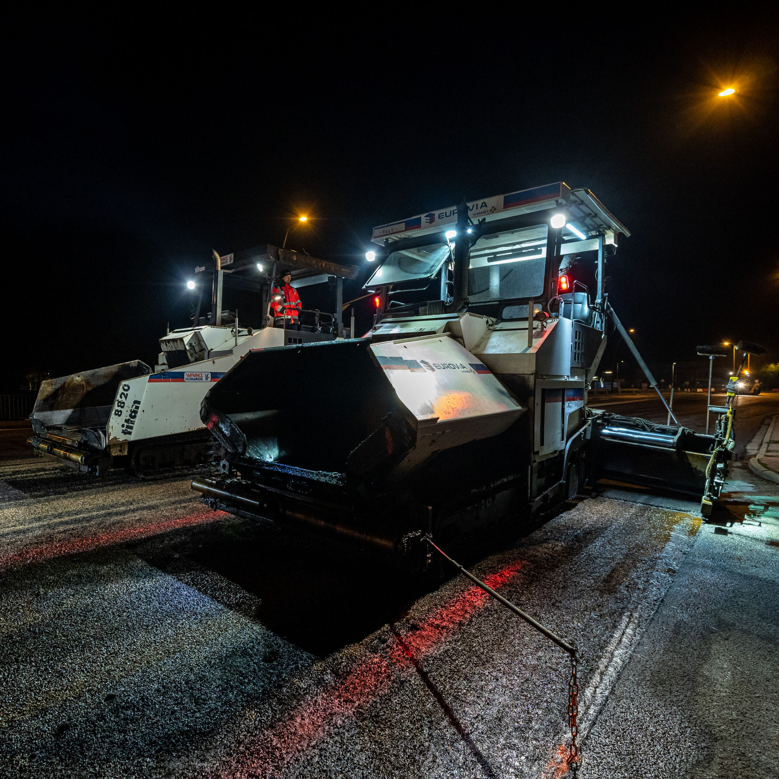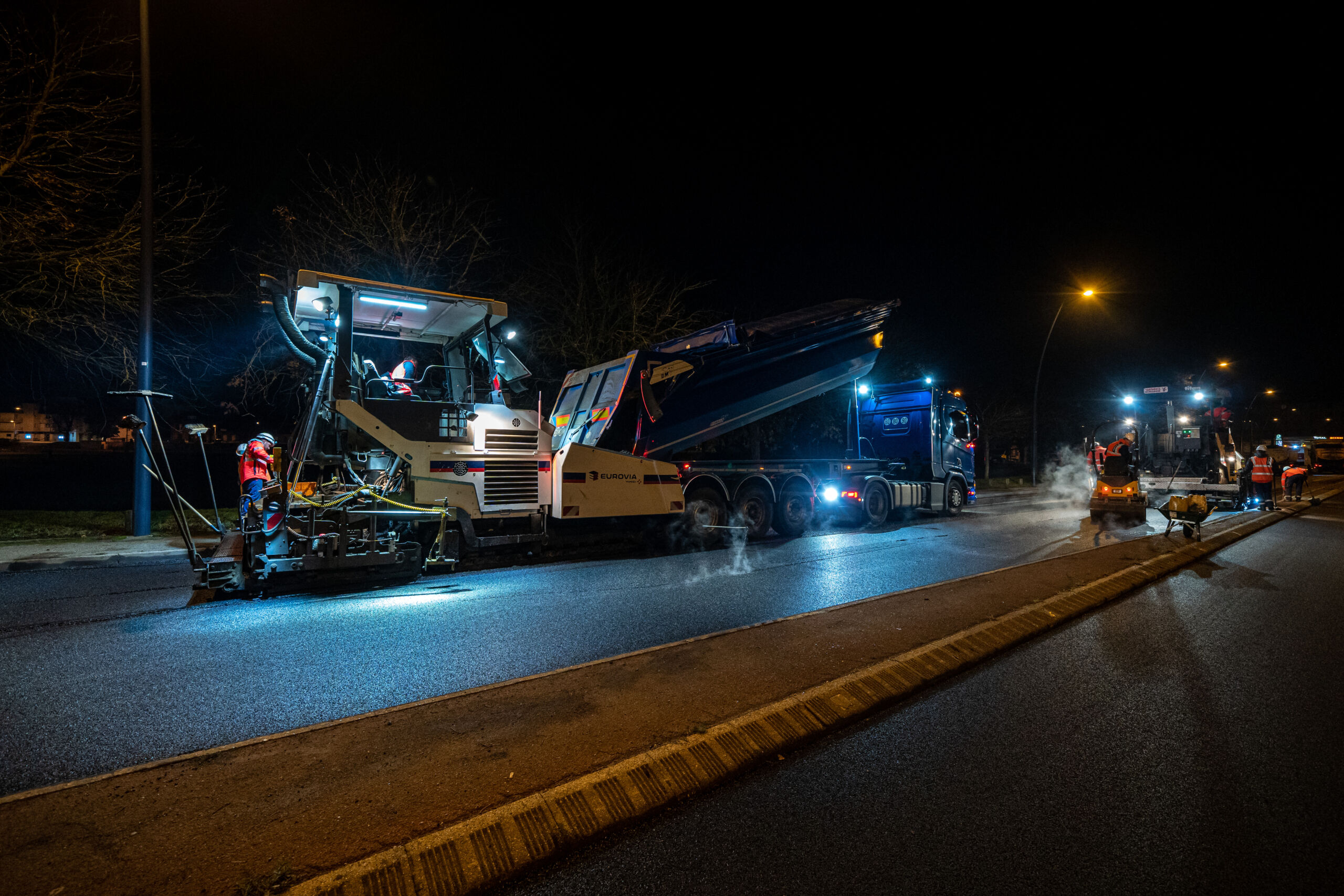 Afin de limiter l’impact sur le trafic routier, tous les travaux ont été réalisés de nuit. Mi-novembre 2021, 27 compagnons se sont donc succédé de 19h30 à 6h pour rénover la chaussée et appliquer du Viaphone® cet enrobé spécialement conçu pour diviser par deux la perception du bruit de roulement des véhicules. Le Viaphone® a été fourni la Société des Matériaux Enrobés de l’Eure, une usine d’enrobés Eurovia.