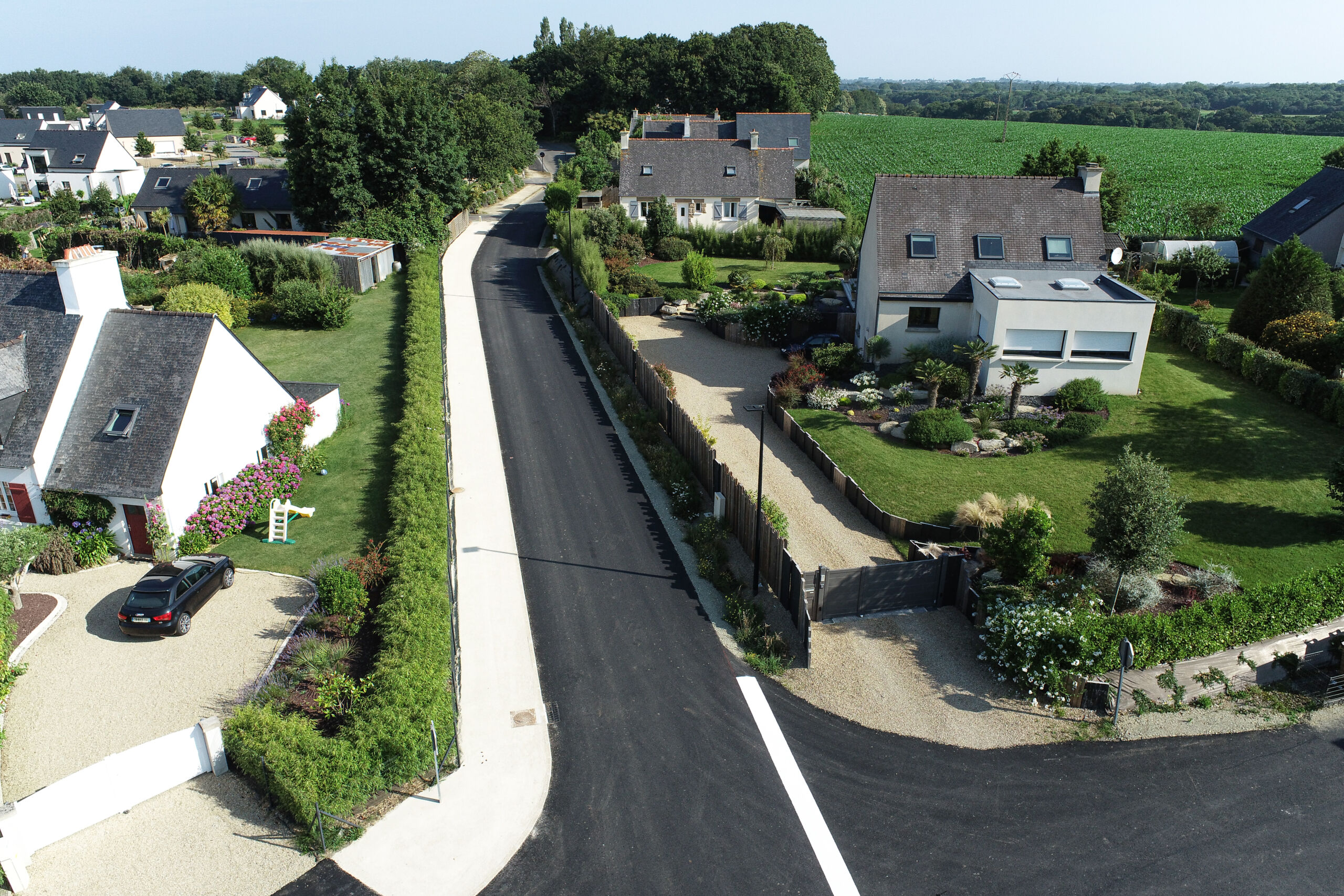 Les équipes ont donc démoli les revêtements, supprimé les fossés et réalisé les terrassements afin de décaisser les trottoirs. Elles ont ensuite construit des avaloirs pour les eaux pluviales, fourni et posé des bordures T1, des caniveaux béton CC1 et des canalisations. Des places de stationnement ont été créées rue de Kervénalen et une réfection complète de la chaussée réalisée par la mise en œuvre d’enrobés à chaud sur la chaussée et du stable stabilisé sur les trottoirs.