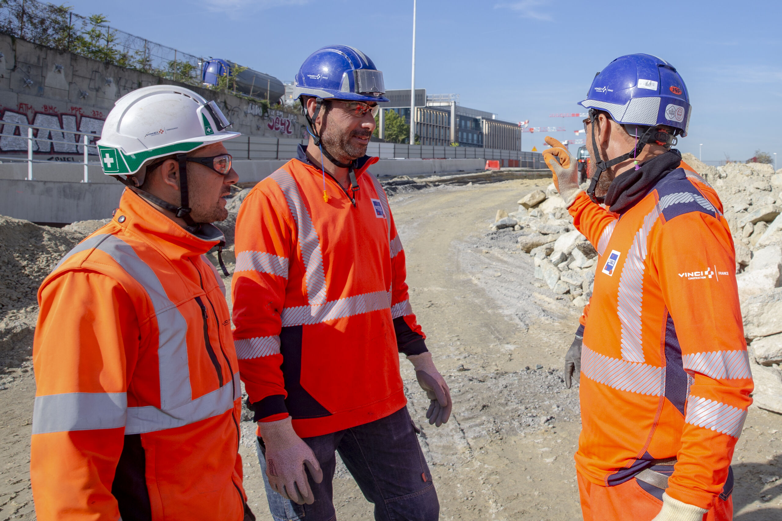 Le groupement composé de l’agence Eurovia d’Aubervilliers (mandataire), de Chantiers Modernes Construction et de Botte Fondations (toutes trois filiales de VINCI Construction) réalise le lot 1 : travaux de voiries et réseaux divers et de génie civil du secteur 1 (emprise nord), d’octobre 2022 à avril 2024. Le secteur 1 se situe à Saint-Denis (93) et se compose de la rue des frères Lumière, la rue Volta, la rue Ampère, la place olympique haute et les deux jardins bas. Les équipes de l’agence Eurovia d’Aubervilliers mènent les travaux de démolition, de terrassement, d’assainissement, de revêtements, d’installation de chantier, de réseaux, la pose de bordures, de clôtures, de mobilier urbain et la création de tranchées. Chantiers Modernes Construction créé les murs de soutènement et les passerelles et Botte Fondations réalise les travaux de fondations sur pieux et micropieux. Signature (filiale de VINCI Construction) intervient comme sous-traitant du groupement afin de réaliser le balisage, les dispositifs de retenue ainsi que la signalisations horizontales et verticales. Navarra intervient également comme sous-traitant pour les travaux de dépollution.