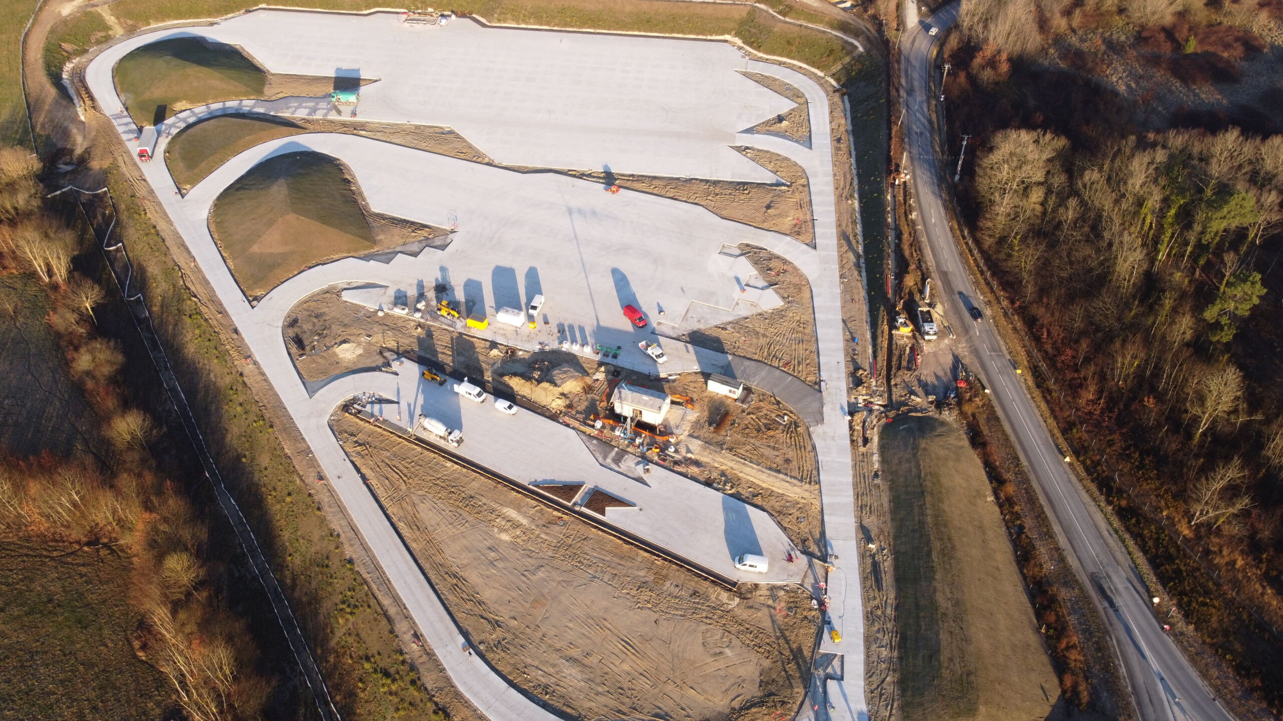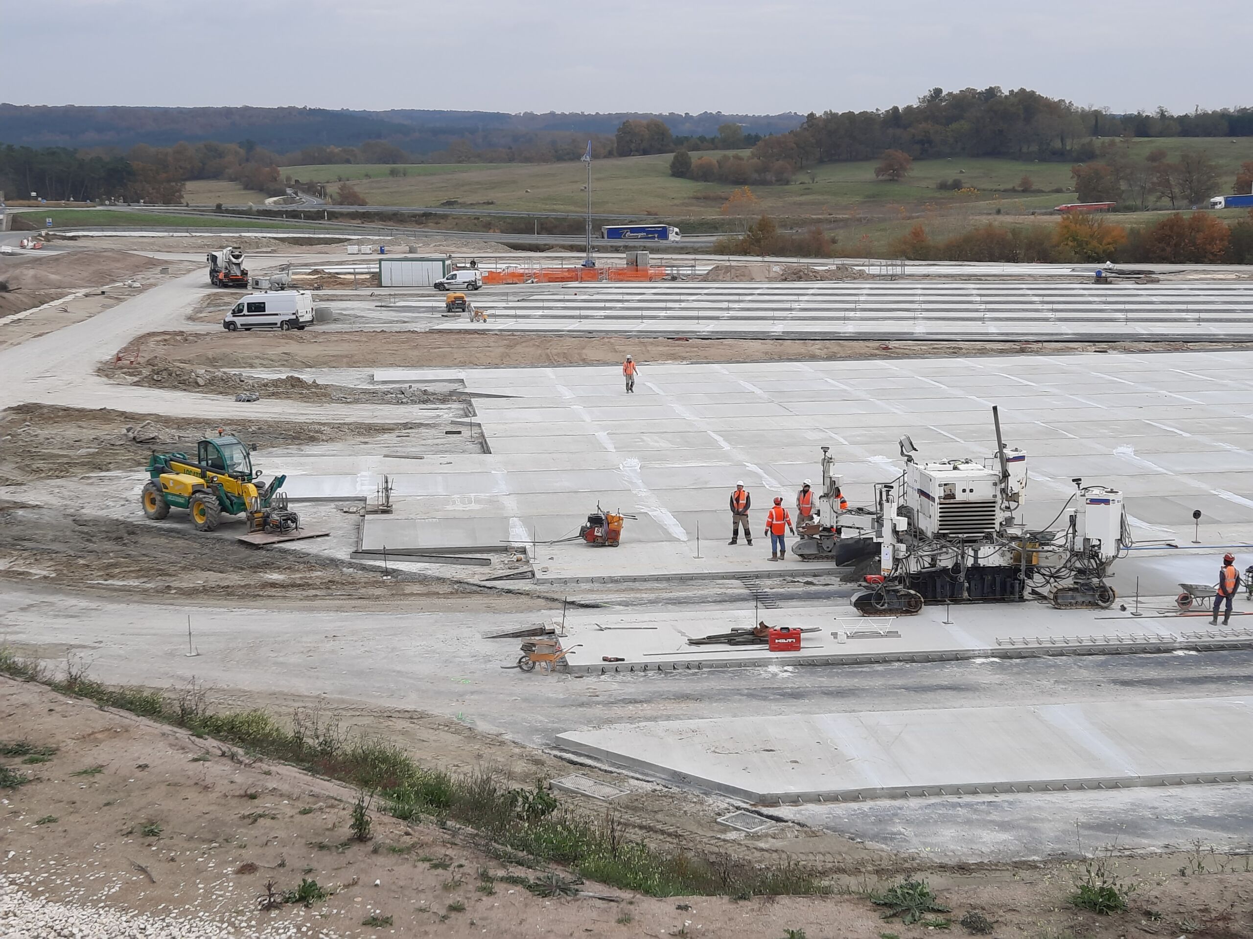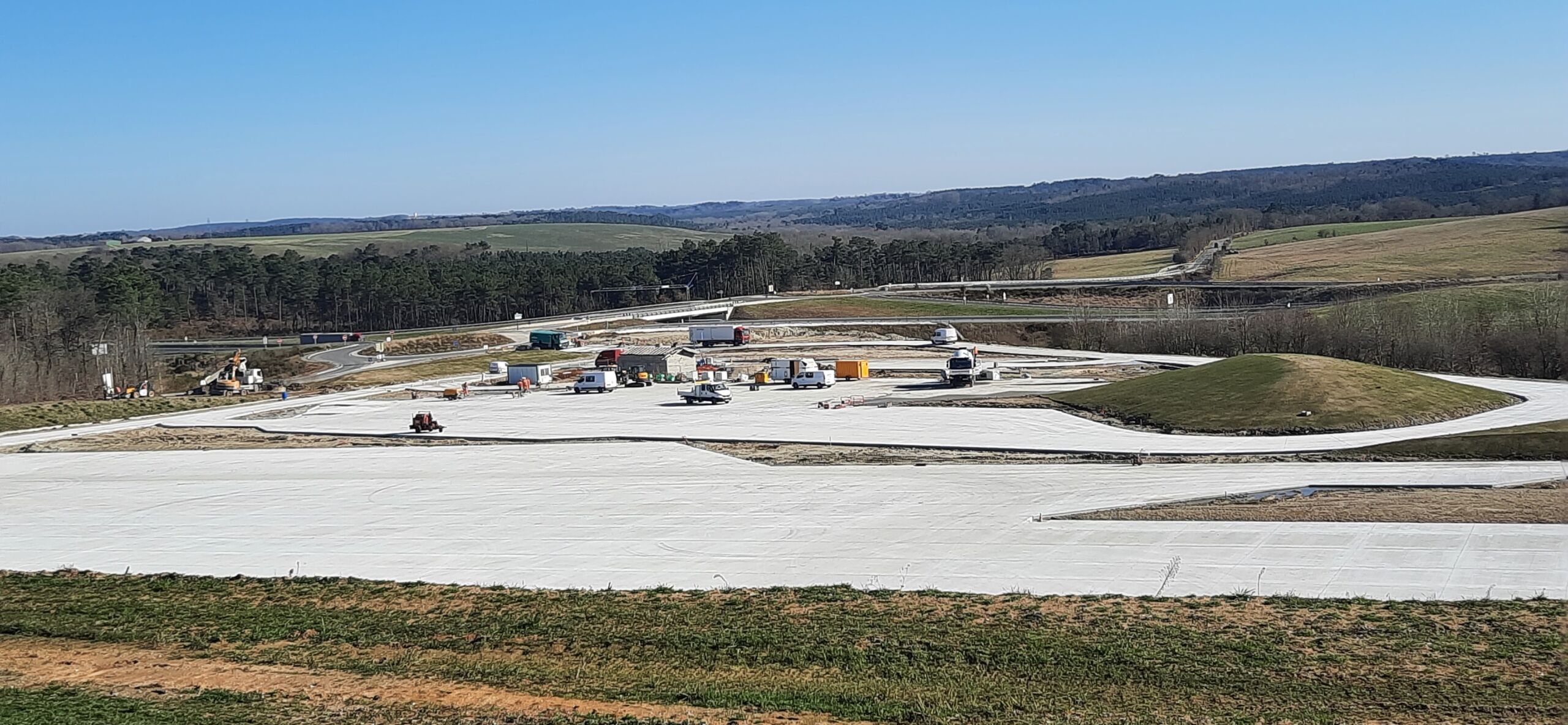 Axe structurant du réseau routier de Nouvelle Aquitaine, la route nationale 10 – reliant Bordeaux à Poitiers – accueille chaque jour 23 700 véhicules dont 41 % de poids lourds. À la suite des travaux réalisés en 2017 et ayant permis le développement considérable de cette route, le groupement composé de l’agence Eurovia d’Angoulême (mandataire), Eurovia Grands Projets France, Cognac TP (toutes filiales d’Eurovia) ainsi que Garraud Terrassement ont réalisé entre octobre 2021 et février 2022 des travaux de terrassements, d’assainissements et de chaussées sur l’aire de repos de « La Grolle » située à Touvérac (16). Les équipes ont pris part à la création de parkings pour poids lourds et pour véhicules légers en chaussée béton ainsi que de la route de liaison faisant leur jonction. Des dalles goujonnées d’une épaisseur de 18 cm – réalisées à l’aide d’une « Slipform Wirtgen SP500 » – ont été développées pour le parking poids lourds tandis que le parking pour véhicules légers a été conçu grâce à des dalles non goujonnées d’une épaisseur de 14 cm et réalisées à la règle vibrante. La totalité du revêtement de l’aire de service a été réalisée en béton avec une finition de surface balayée.