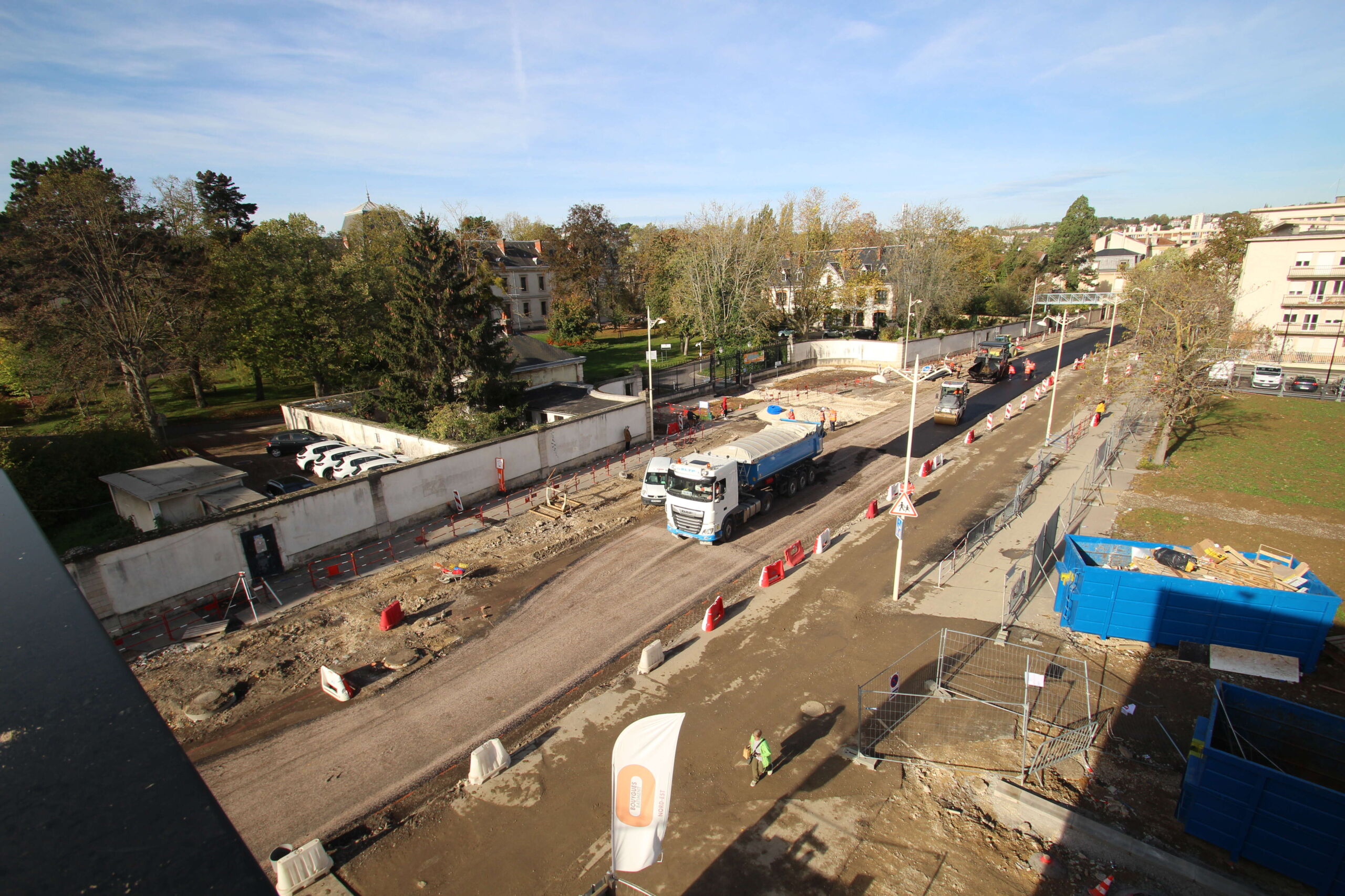 Les travaux comprennent l’aménagement de la voirie et des trottoirs et la création d’une piste cyclable. Les équipes réalisent la réfection des chaussées, la pose de bordure-caniveaux et de pavés, la mise en œuvre d’asphalte sur les trottoirs, la création de structures réservoir et de pistes cyclables en enrobés clairs, cela afin de différencier les flux de circulation.