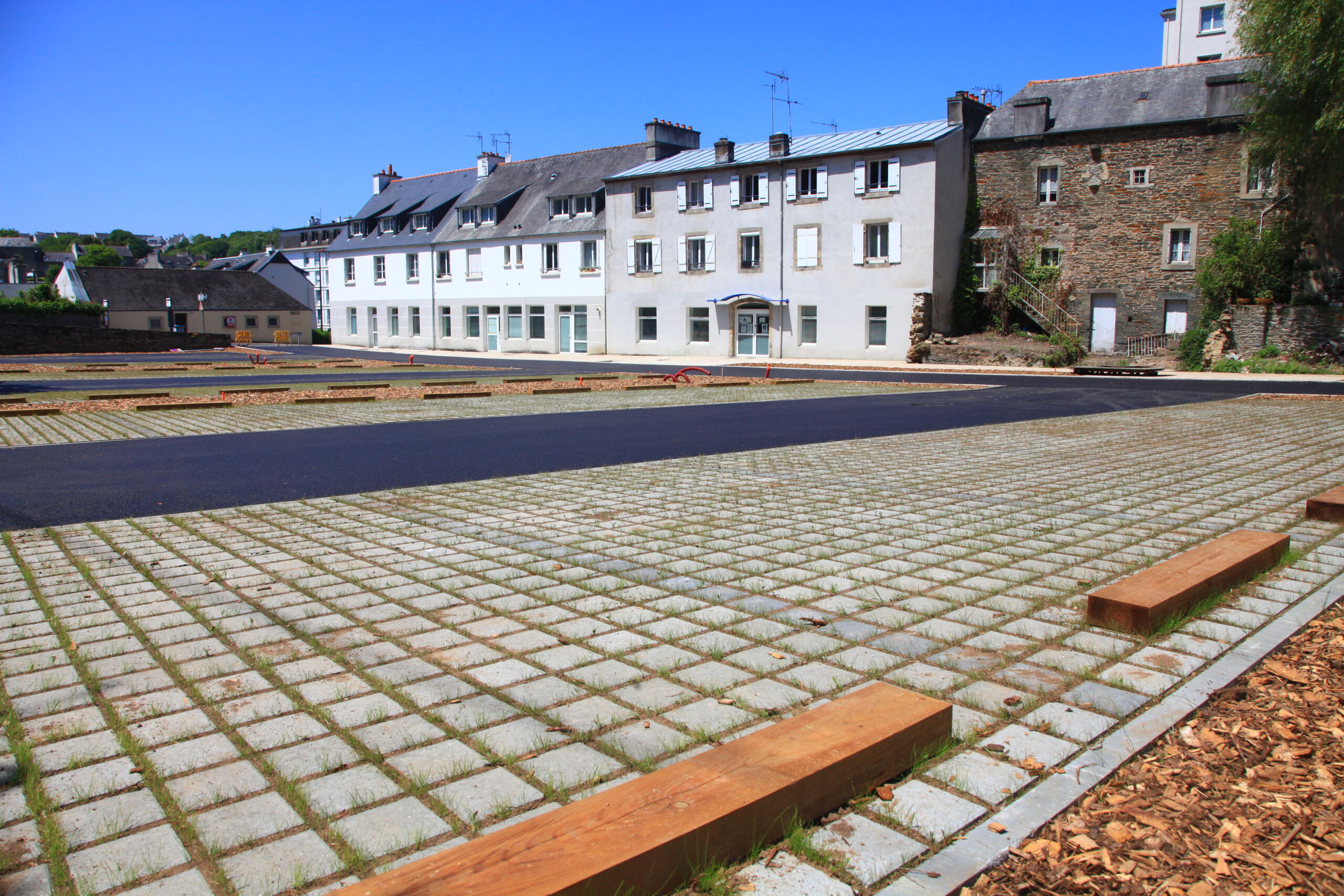 Le groupement composé de l’agence Eurovia de Morlaix (mandataire) et de Sparfel a réalisé – du 23 janvier au 23 juin 2023 – le lot 1 de terrassements, de voiries et de réseaux divers. Des enrobés GOASQ, des pavés Ecodrain® et du béton sablé ont notamment été utilisés. Les 2 000 m2 d’espaces de stationnement ont été réalisés en revêtement perméables afin de permettre l’infiltration des eaux de ruissellement.