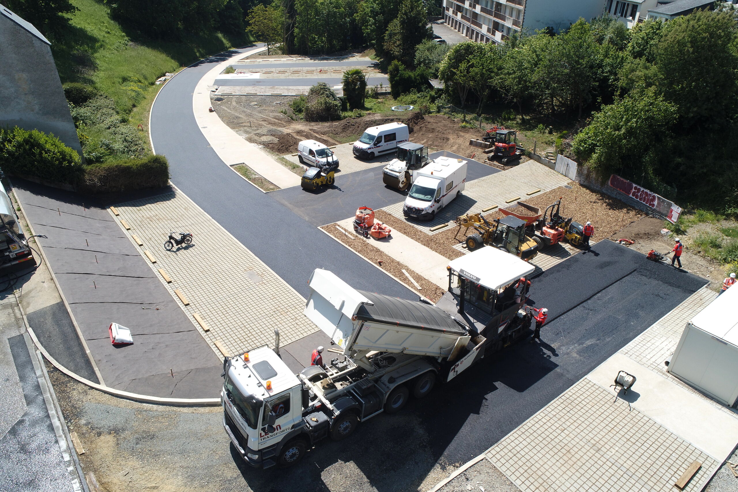 Les travaux ont été réalisés en 2 étapes : une 1ère intervention en partie haute du parking (permettant de maintenir les espaces de stationnement en partie basse du parking) et une 2e intervention pour la partie basse. Afin de limiter l’impact des travaux sur les riverains, les enrobés ont été mis en œuvre en une seule intervention.