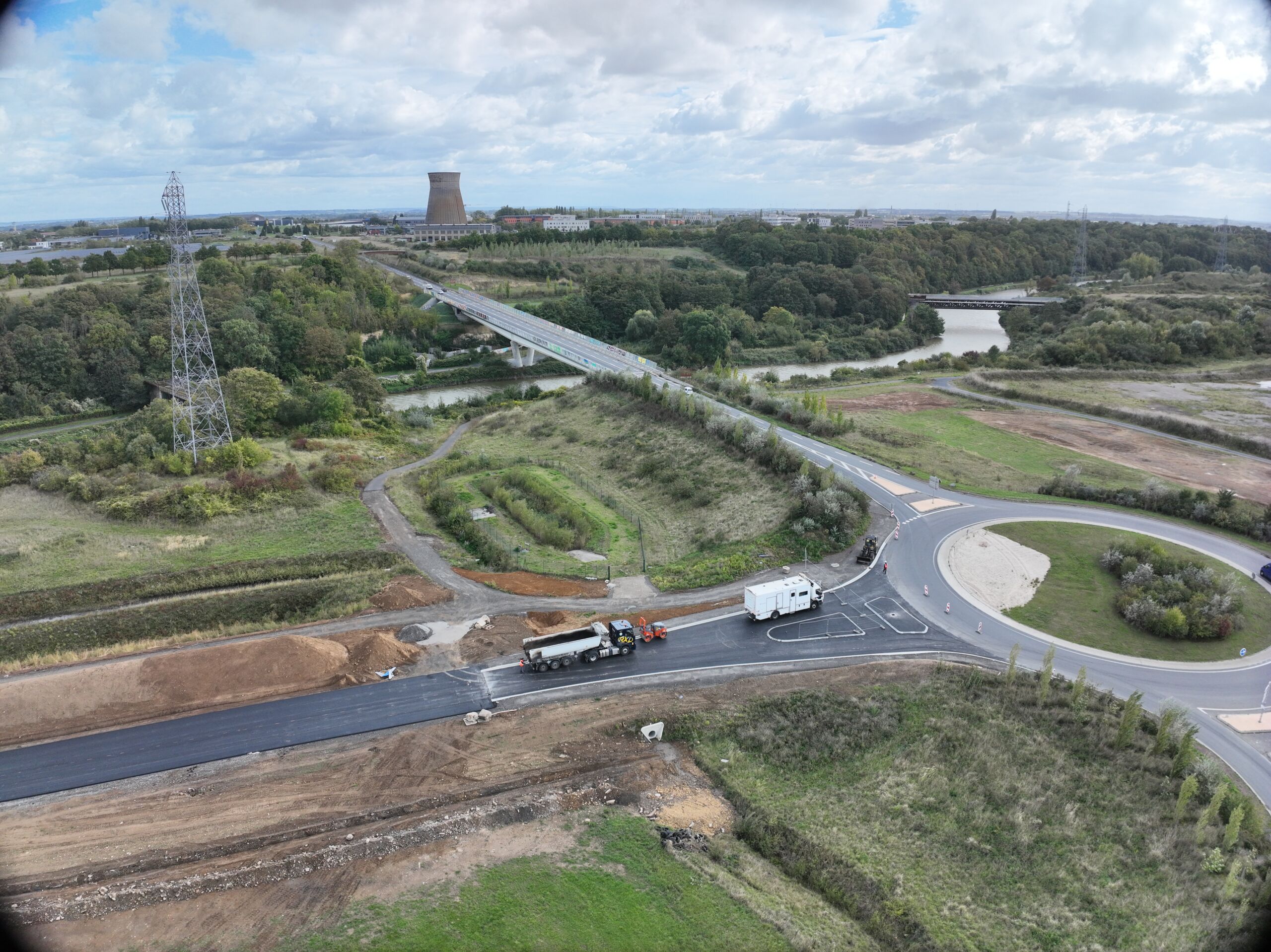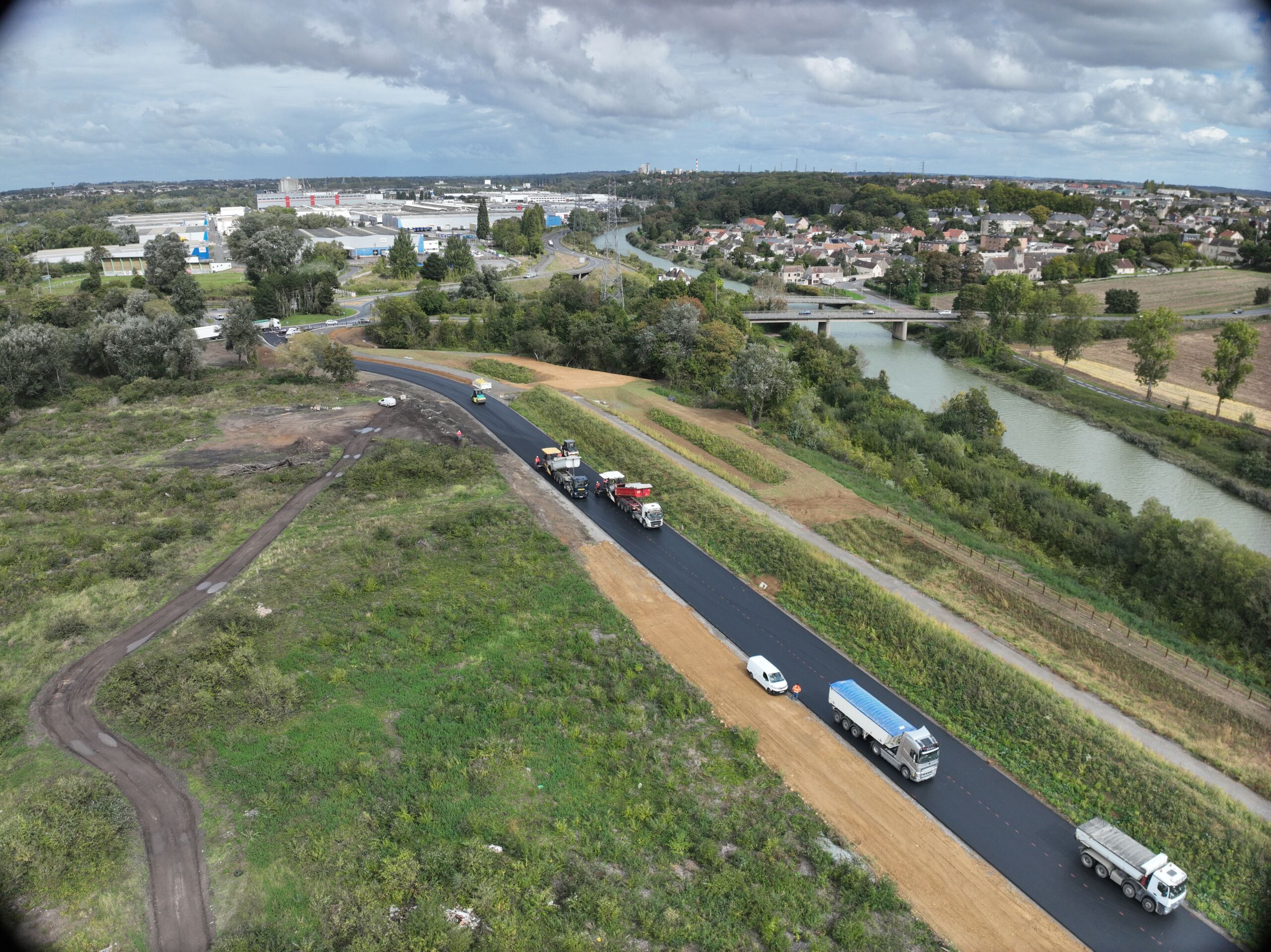 Les équipes interviennent sur un terrain vierge. Elles ont réalisé dans un premier temps les travaux de terrassement, avant de s’atteler à la création des voiries du futur axe. Afin de garantir la stabilité des sols et la durabilité de l’ouvrage, le chantier a prévu la mise en place de préchargements ainsi que la pose de drains verticaux, confiée à Menard (VINCI Construction). Ces dispositifs ont permis de stabiliser le terrain au point de croisement avec le fossé de ligne reliant le canal à l’Orne.