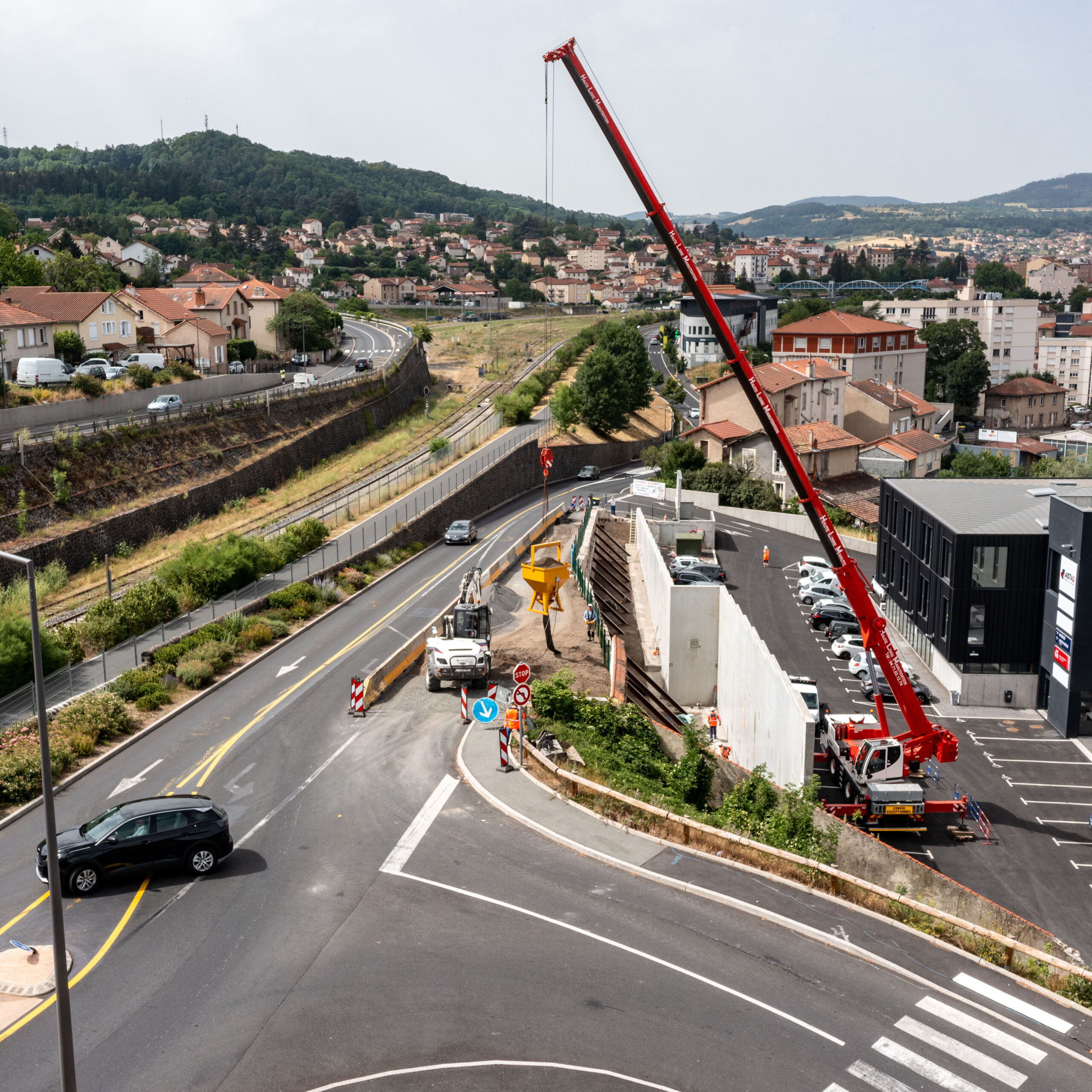 - La phase 1, réalisée de mars à avril 2022, a consisté à la modification d’un ancien carrefour à feux en giratoire. Situé en partie inférieure du chantier, cet aménagement permettra de fluidifier la circulation dans le sens Est/Ouest et de fournir un meilleur accès aux riverains