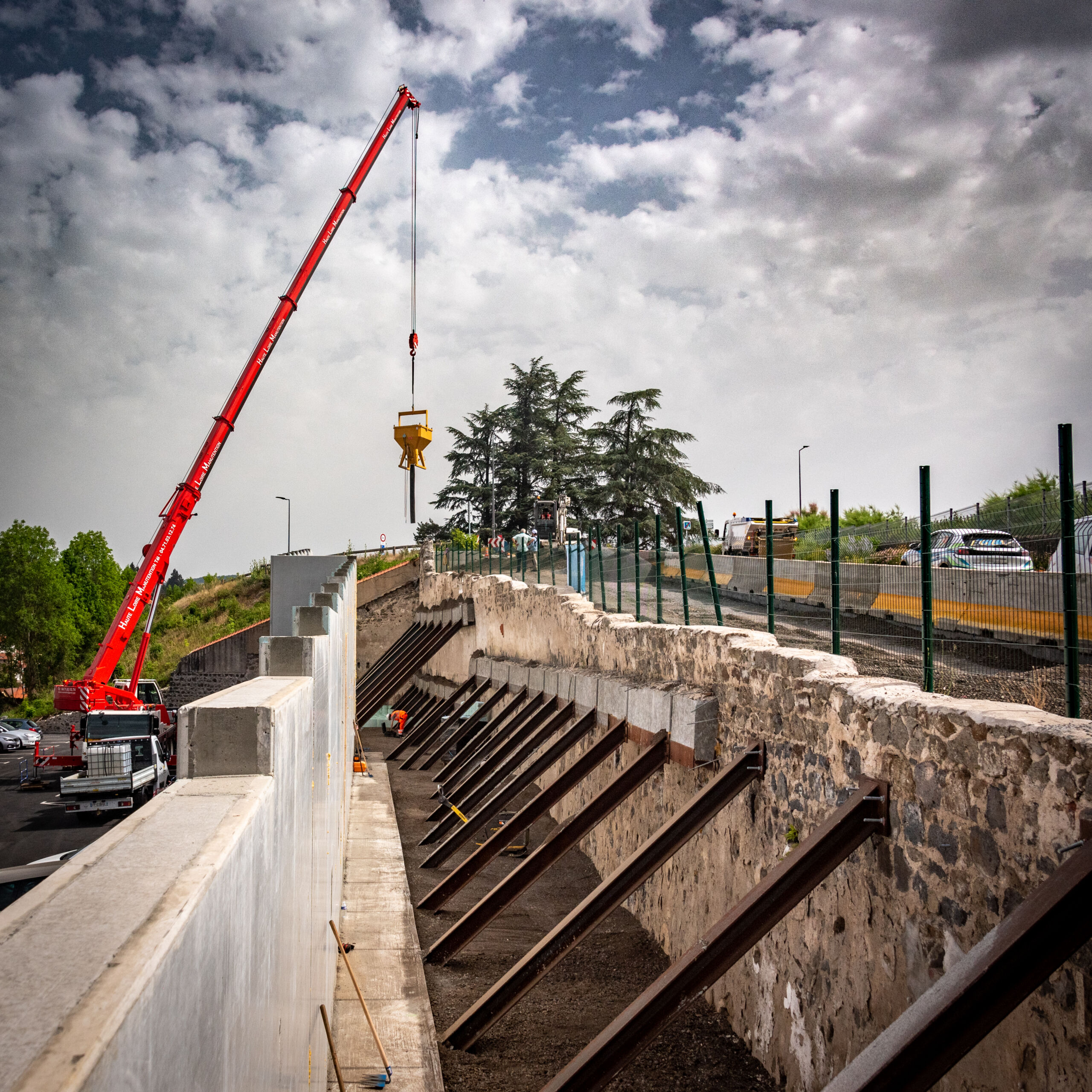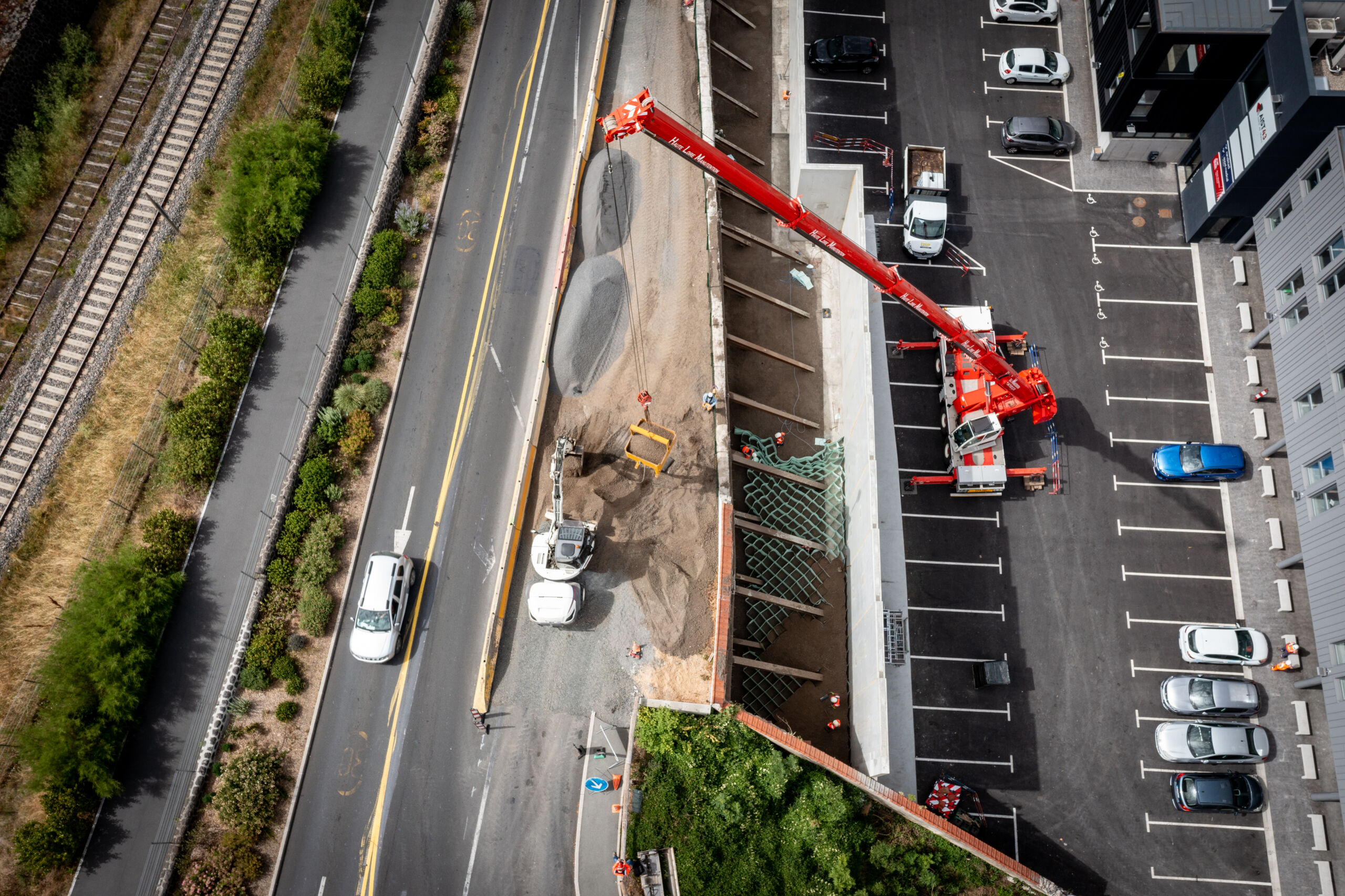 Le phasage de ce chantier – proposé dès l’appel d’offre – a été pensé afin de maintenir une double voie de circulation pendant toute la durée du chantier. Cette contrainte a donc pu être respectée lors de la construction du giratoire et du confortement en nappes alvéolaires M3S grâce à la réalisation des travaux d’enrobés et à la pose de prémurs réalisées de nuit ainsi qu’à la construction du mur M3S depuis le bas du soutènement avec une grue mobile 80T.
