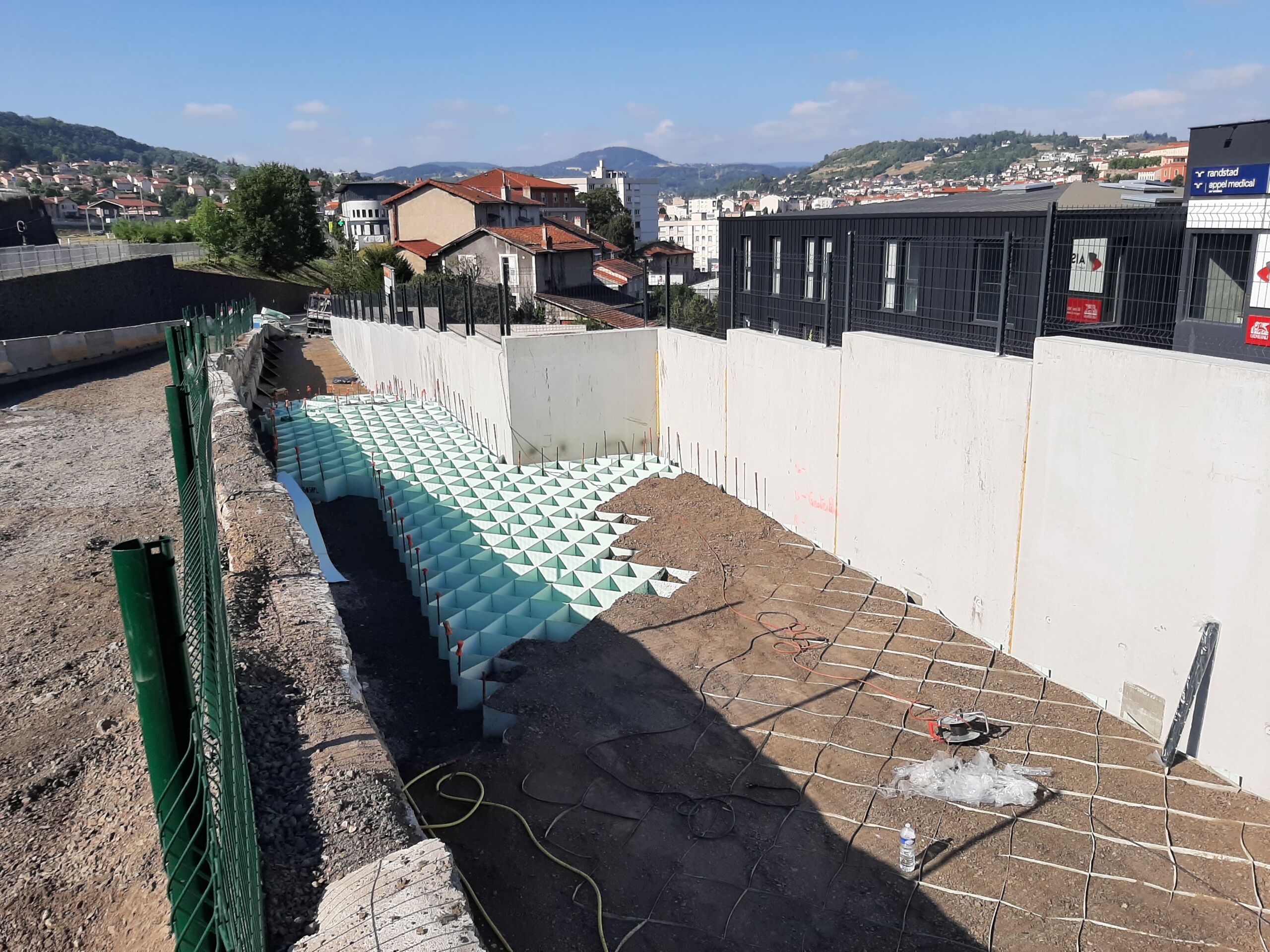 La difficulté principale de ce chantier venait de son exiguïté et du montage du remblai alvéolaire jusqu’à 8 m (au plus haut). Des mesures ont été mises en place afin de prémunir les collaborateurs du risque de chute notamment lors de montages de remblais.