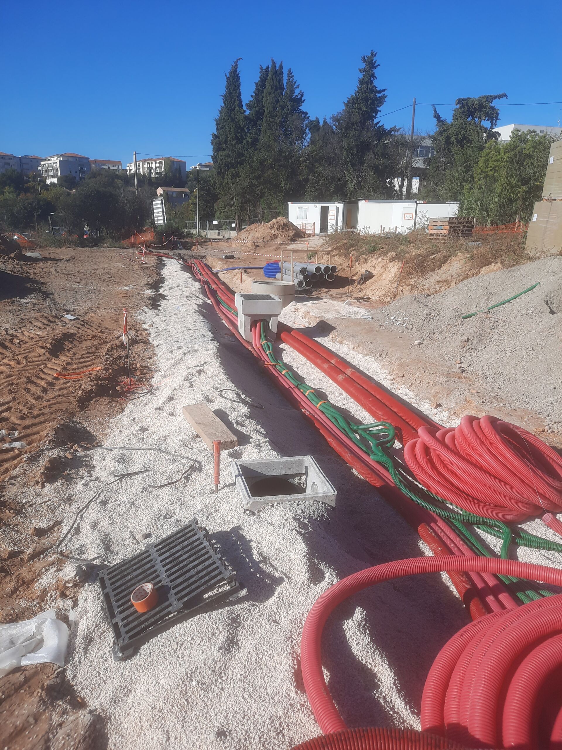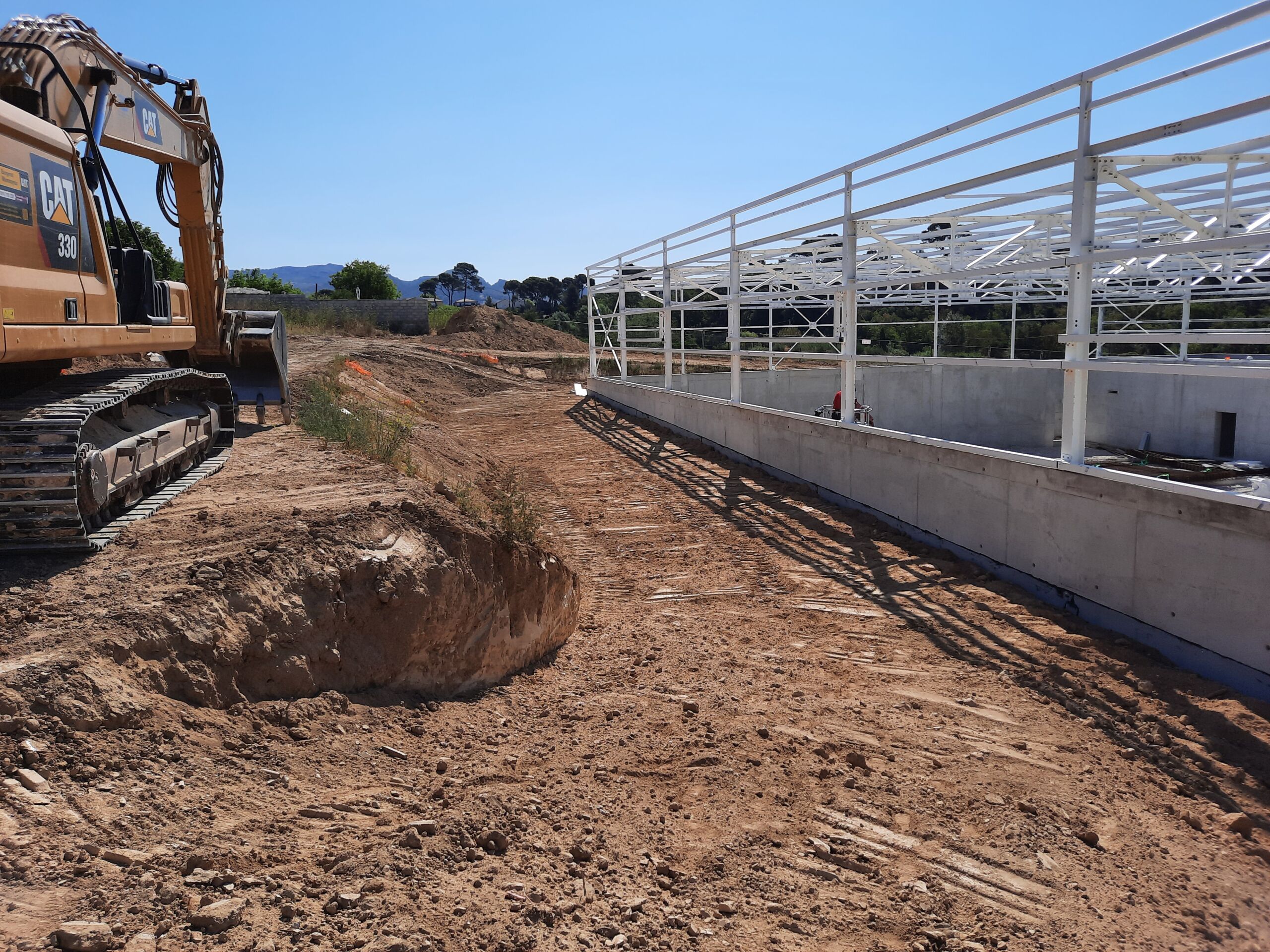 Les travaux ayant été lancés en février 2021, l’agence Eurovia de Marseille a déjà réalisé le terrassement de la plateforme du bâtiment, la pose de nouveaux réseaux secs et humides ainsi que la mise en forme d’un pas d’âne pour accéder au parking des étudiants. D’ici la livraison, en avril 2022, les équipes termineront la pose de voliges en acier corten afin de délimiter les zones piétonnes, mettront en œuvre les enrobés, procédèront aux aménagements paysagers et couleront les bétons désactivés – naturellement colorié de jaune, signature des carrières d’Aubagne – afin d’apporter du rayonnement à ce nouveau gymnase.