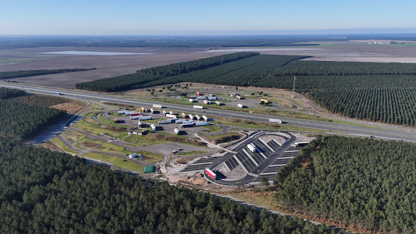 De septembre 2024 à juillet 2025, l’agence Lafitte TP, en groupement avec l’agence Eurovia de Gironde, a mené, pour le compte du concessionnaire Atlandes, un chantier d’envergure visant à étendre et reconfigurer les parkings poids lourds des aires de repos de Labouheyre (40) et de Lugos (33), situées sur l’autoroute A63. Il s’agit d’une première en France, portée par un double objectif : fluidifier le trafic et améliorer la qualité de service proposée aux transporteurs.