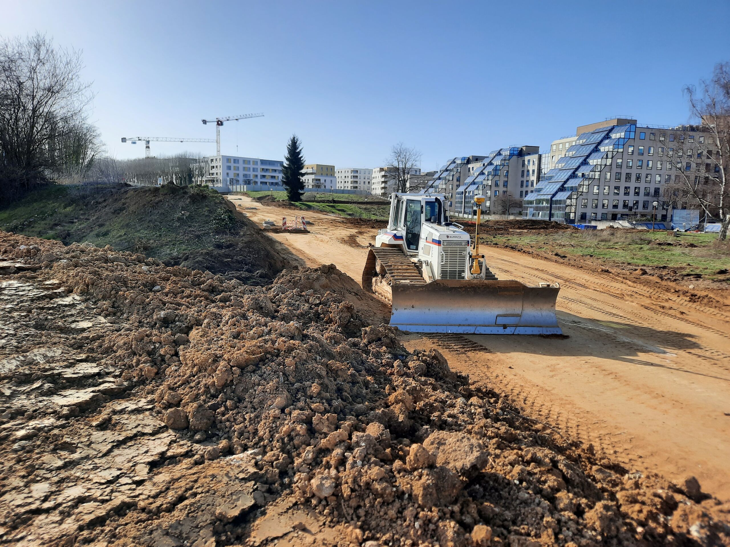 La coactivité sur site est très forte tout au long du projet : les aménagements tels que les trottoirs, places et revêtements qualitatifs seront effectués en parallèle des seconds œuvres des lots de constructions. En amont et durant les opérations, des analyses de sols sont faites afin de garantir l’équilibre des terres. Des bennes de tri ont été mises en place pour faciliter le tri et le recyclage des matériaux. Fin des opérations pour Eurovia prévue en décembre 2023.