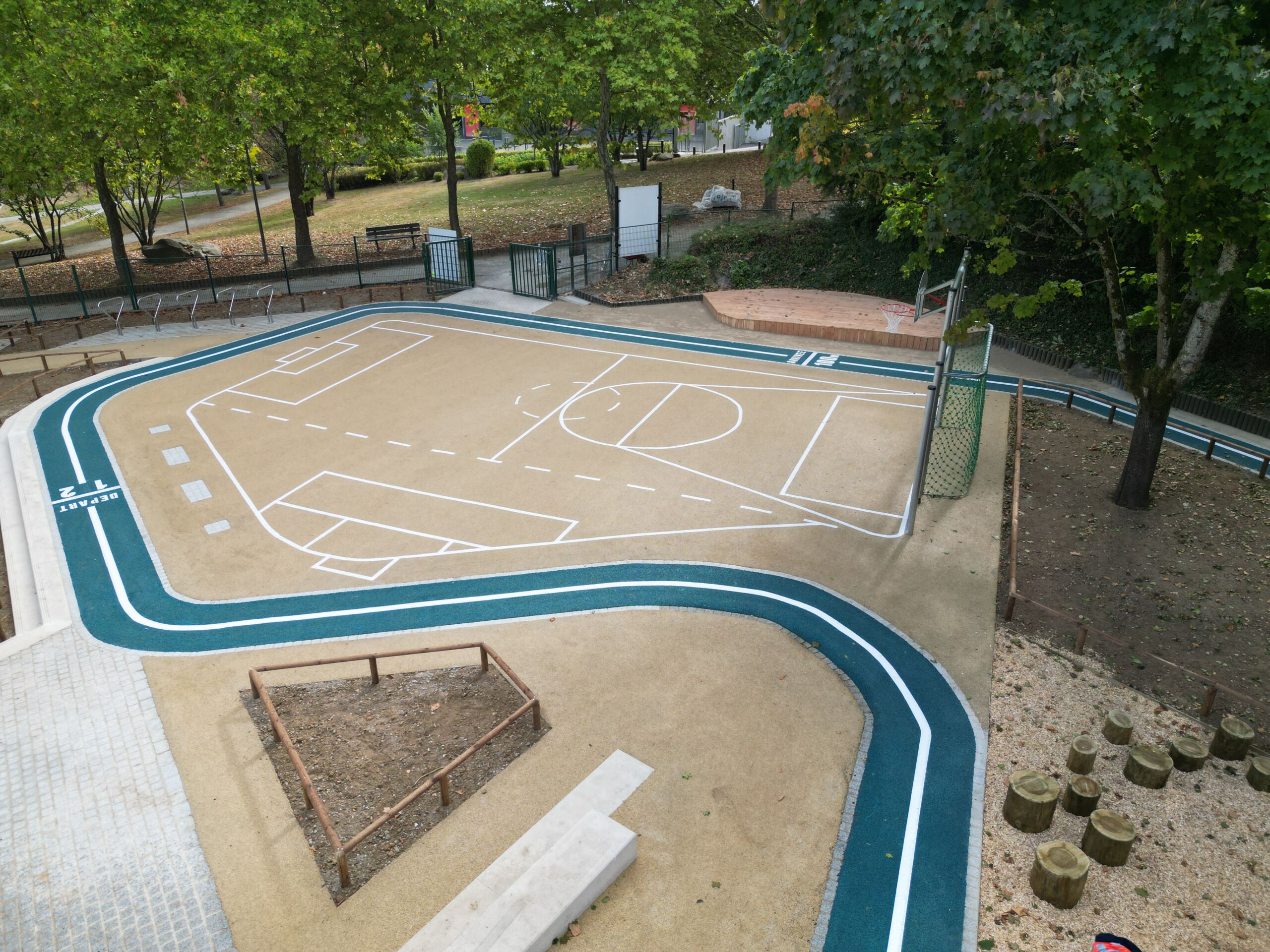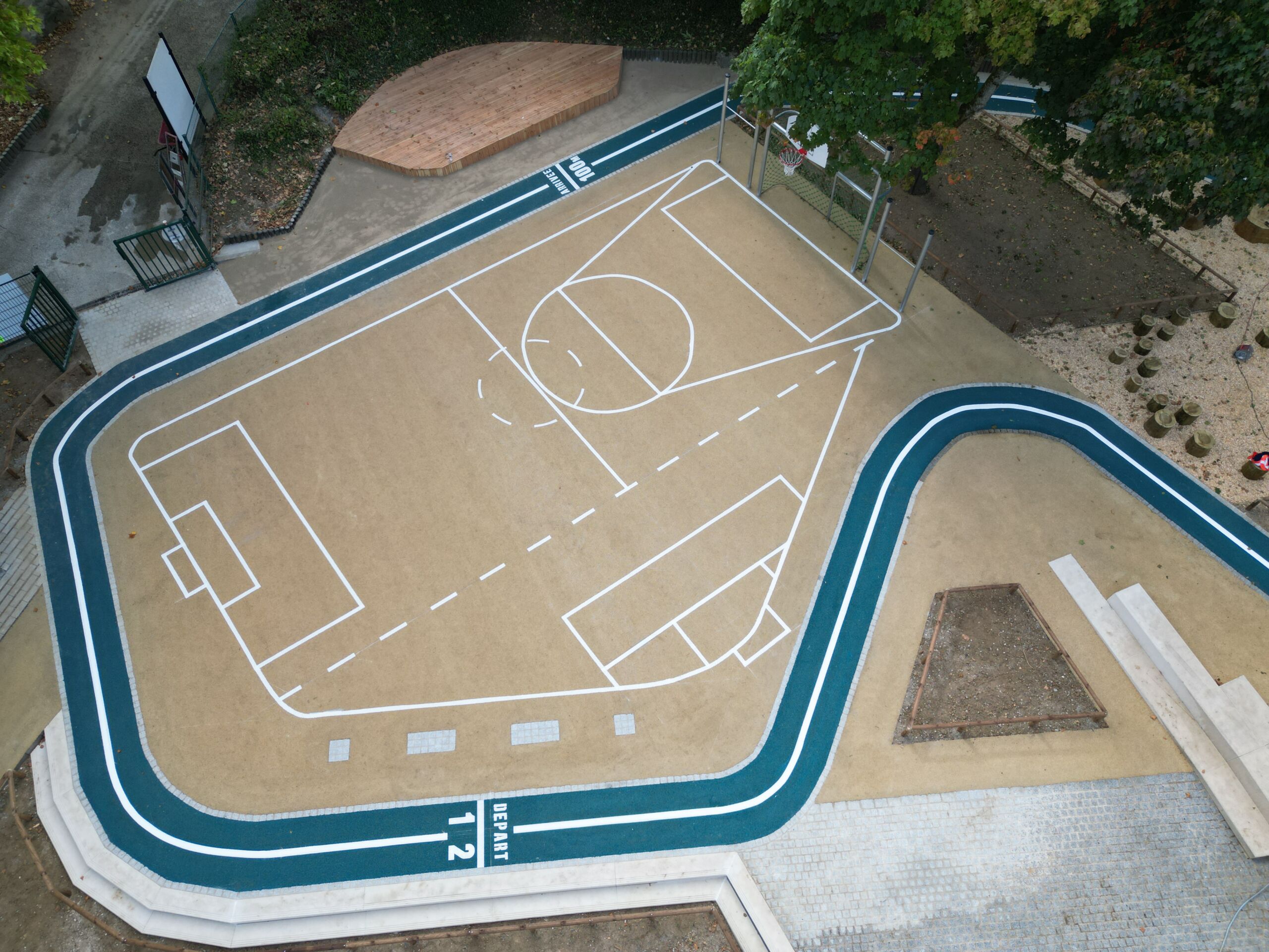 Au total, 1 220 m² de cour ont été rénovés. Seize tonnes d’enrobés drainants bleus et trente-six tonnes d’enrobés drainants beiges ont été mis en œuvre, améliorant l’infiltration des eaux pluviales et apportant une nouvelle esthétique colorée. La teinte claire des revêtements, alliée à leur fonction drainante, contribuera à créer un îlot de fraîcheur.