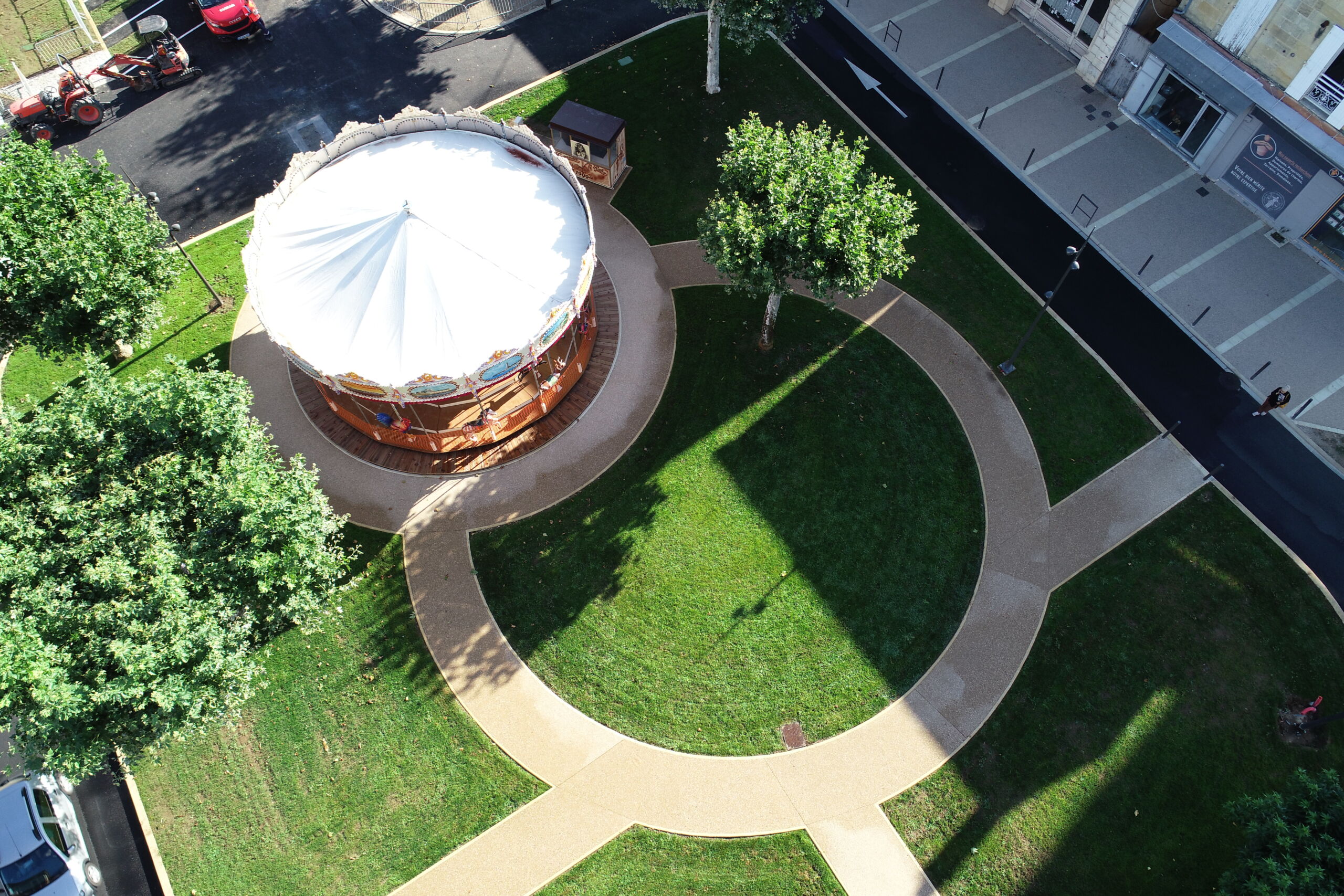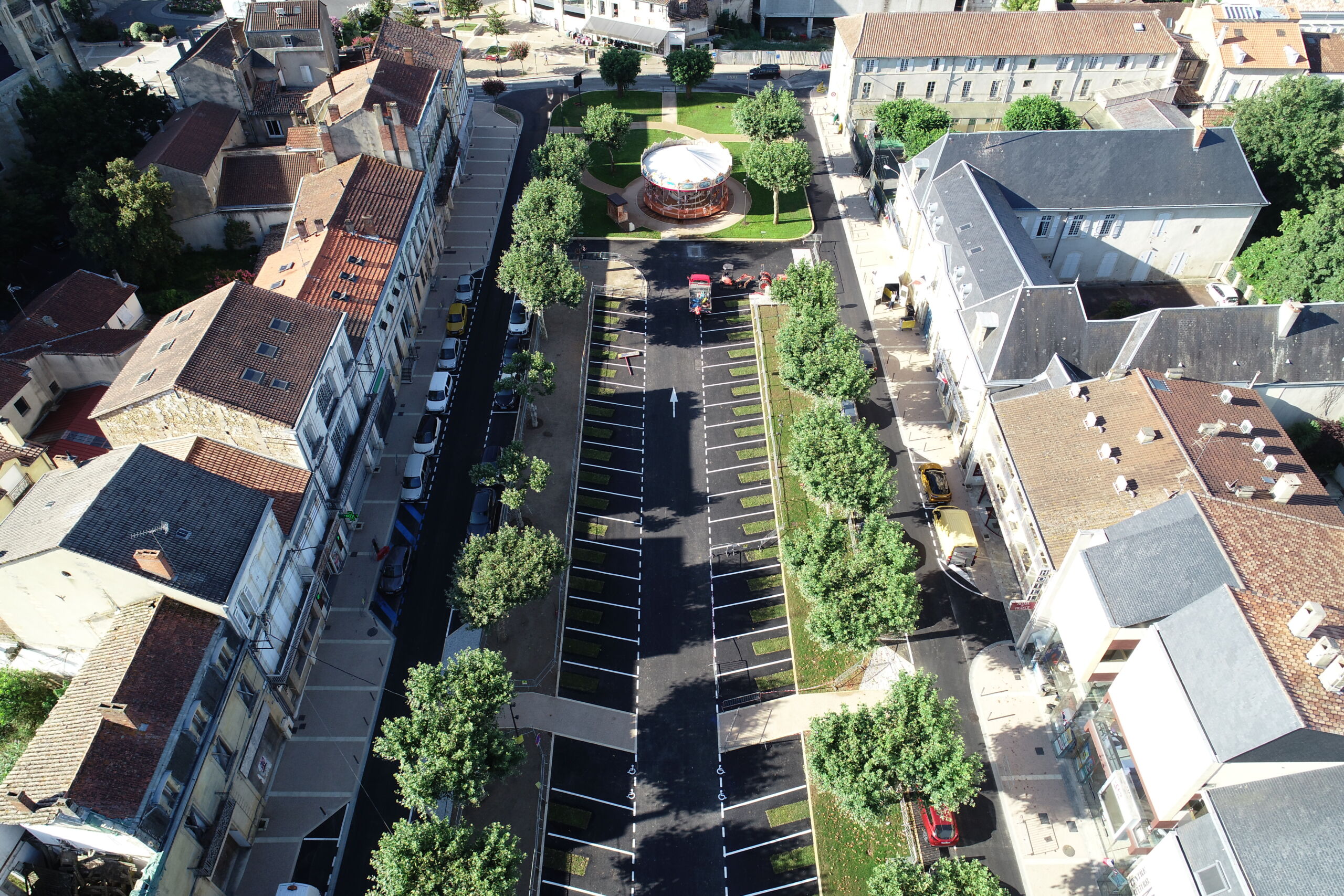 Le programme de travaux a permis de créer 3 000 m² d’espaces verts sur la place contre 450 m² auparavant. Les platanes de l’ancienne place ont été déplacés grâce à une transplanteuse qui récolte l’arbre et ses racines pour les replanter à quelques mètres. L’intérêt est de déplacer les arbres plutôt que de les couper.Des noues paysagères ont également été installées pour collecter les eaux pluviales du parking et les irriguer vers les arbres et autres plantations. Enfin, un îlot de fraîcheur urbain de 1200 m² a été créé devant l’école maternelle et à proximité du carrousel pour les enfants.