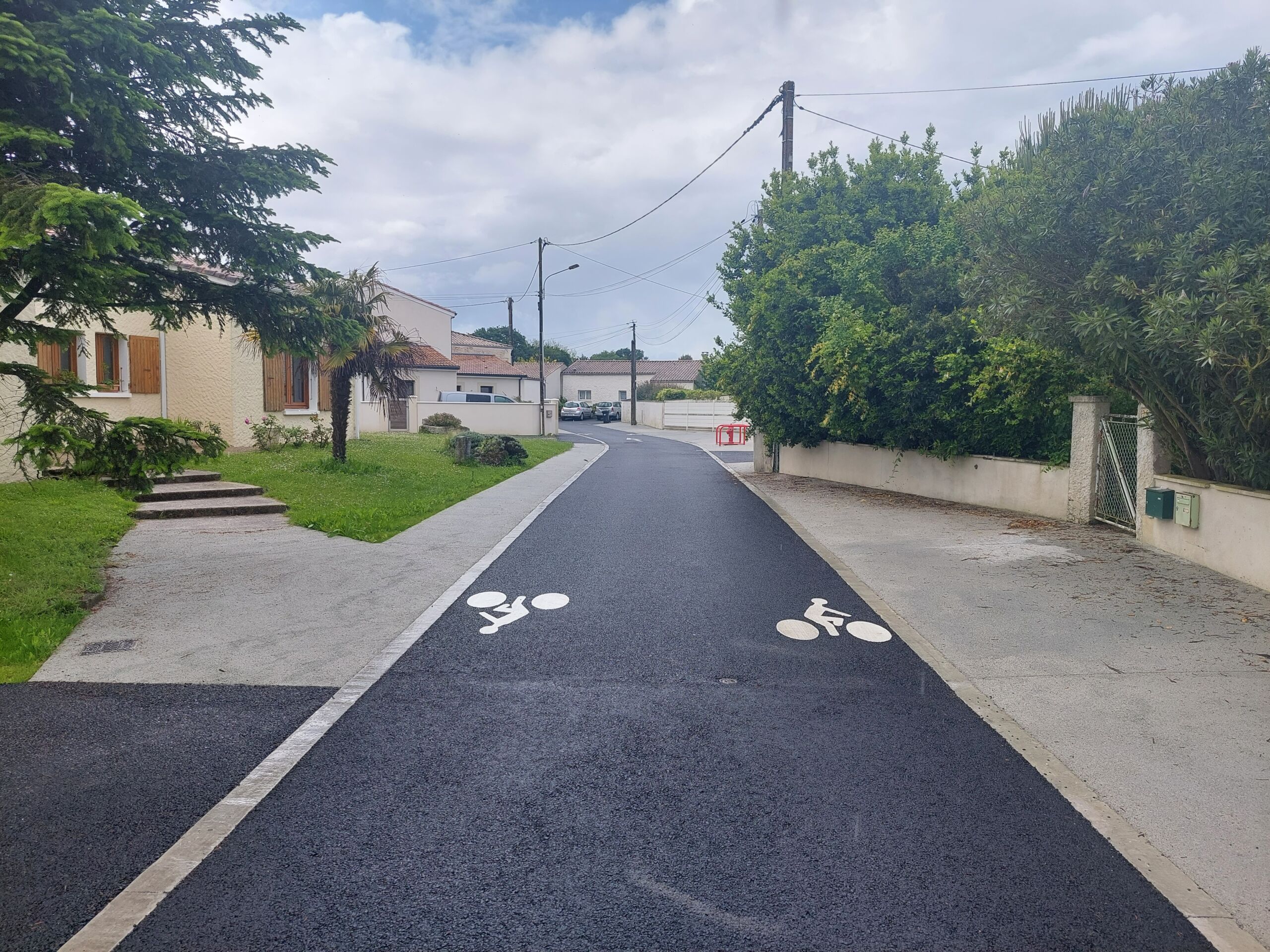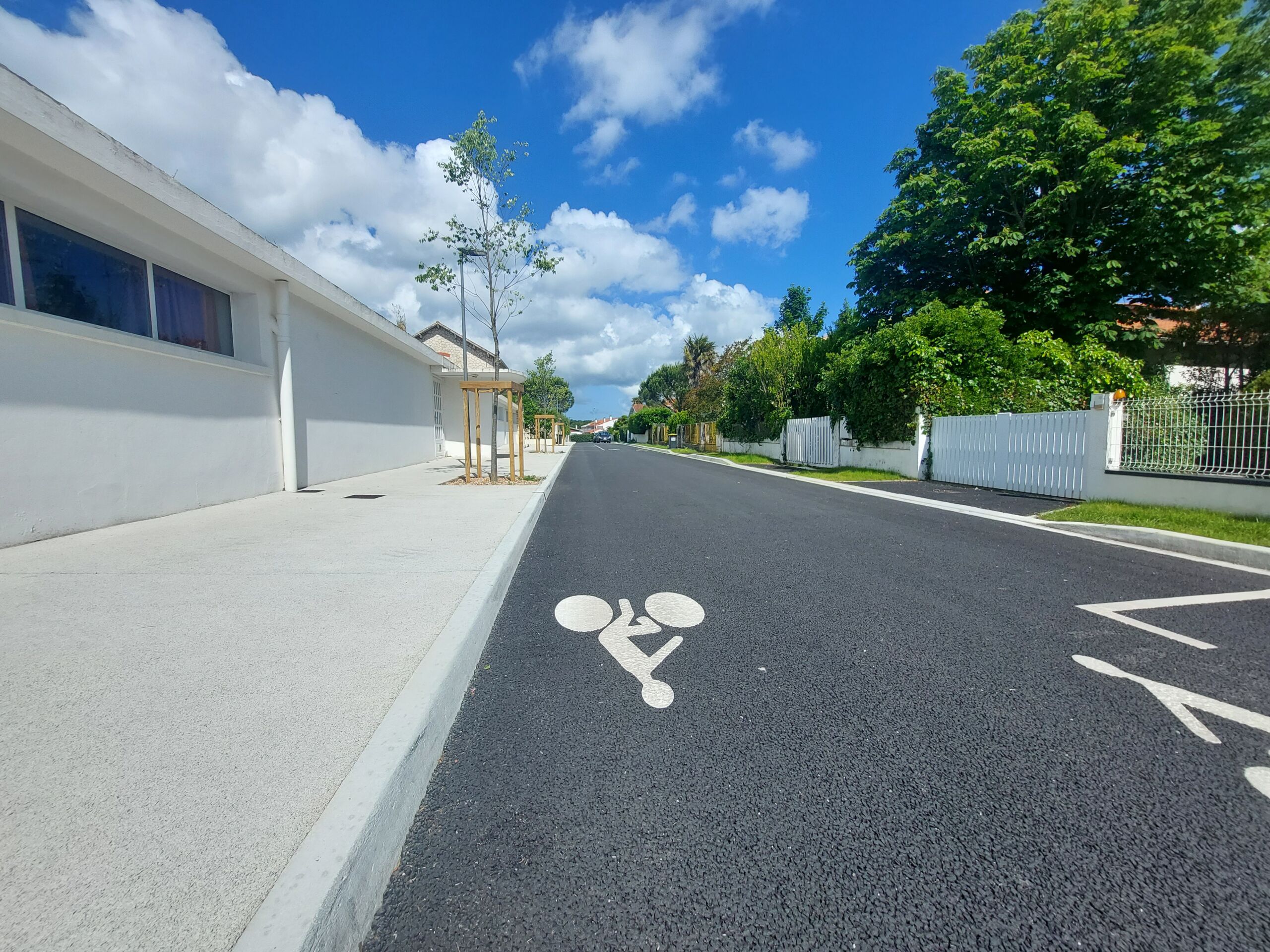 Réalisée de septembre à novembre 2023, la 1e opération consistait à requalifier la rue des Écoles de Saint-Palais-sur-Mer (17). L’objectif de la commune était de déconnecter les eaux de la rue du reste du réseau communal. Les équipes ont conçu une chaussée drainante réalisée au moyen d’une grave recyclée – issue des chantiers de démolition –, mis en œuvre une couche de roulement avec le béton bitumineux Hydrovia®, créé des espaces verts en noues et des trottoirs en béton drainant au ton clair. Le choix de Revilo® s’est révélé d’autant plus pertinent que l’hiver 2023 a cumulé un fort taux de précipitations.