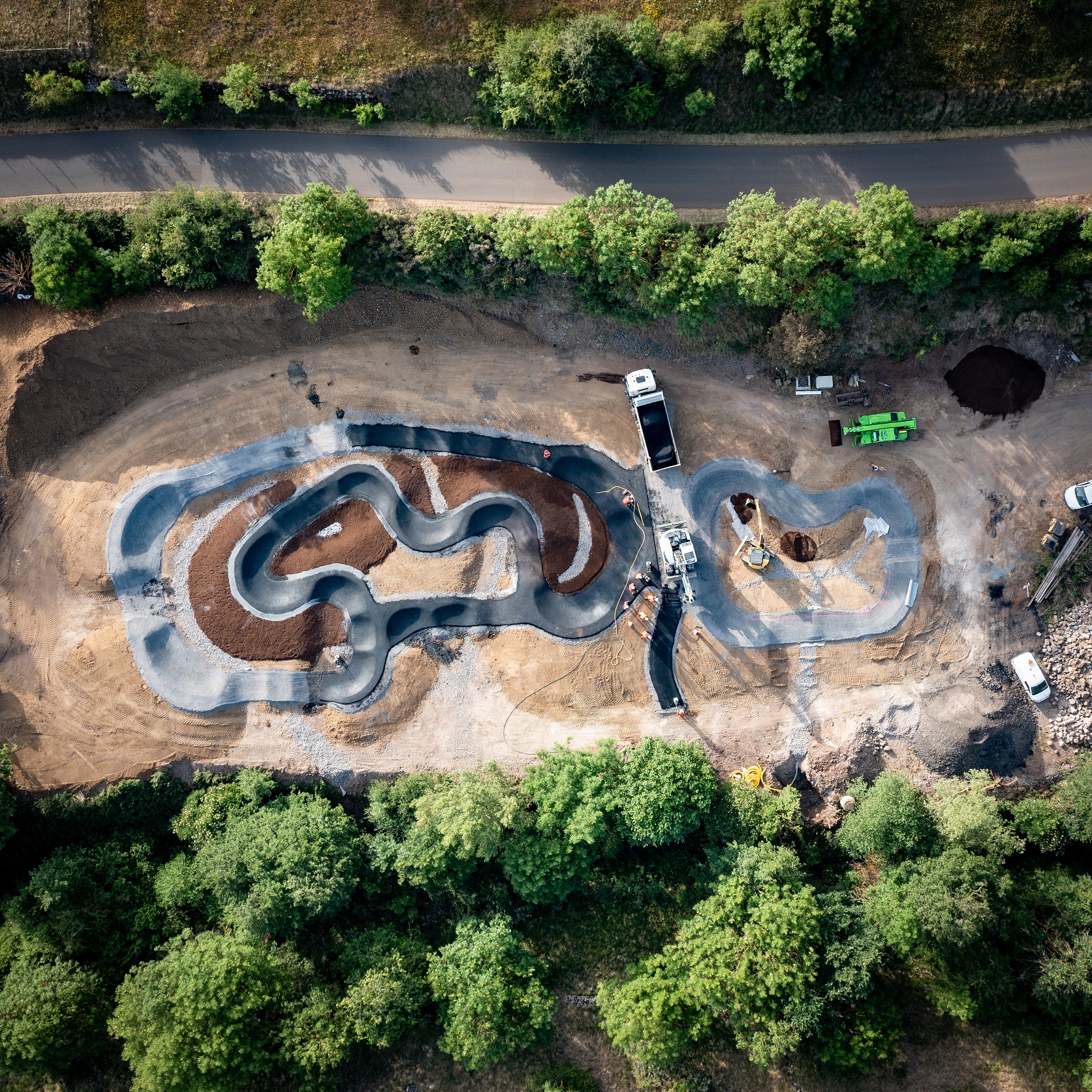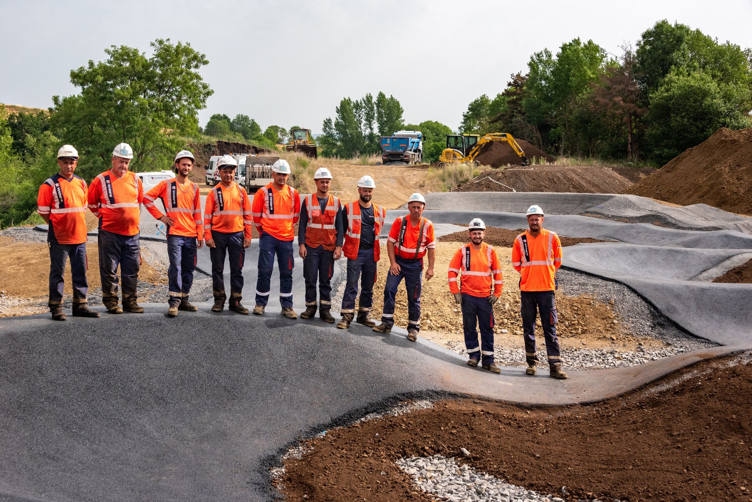 Une formulation de BBSG 0/6 – provenant de l’usine Le Puy Enrobés – et spécialement adaptée aux circuits de pumptrack a été établie. 115 tonnes d’enrobés manuels dosés à 7 cm d’épaisseur ont été mis en œuvre en 2 jours.