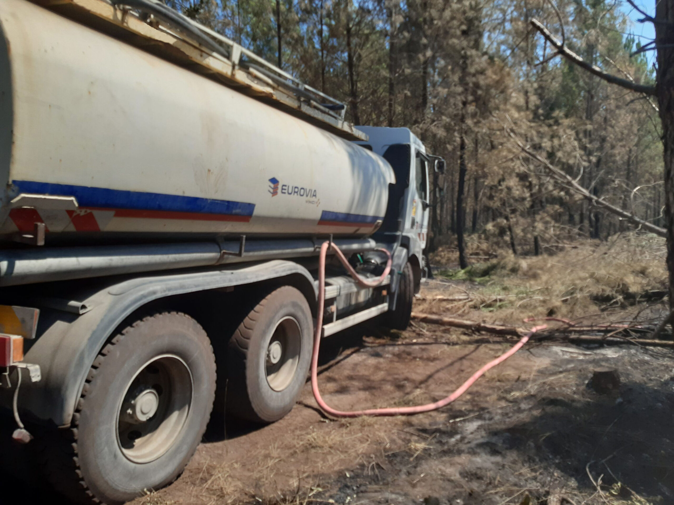 Afin de lutter contre les feux de forêts en Gironde et dans les Landes, l’agence Eurovia de Gironde et Moter sont mobilisées, depuis le 15 juillet 2022, aux côtés des équipes du SDIS 33 – Service Départemental d’Incendie et de Secours – sur le front de l’incendie de Landiras (33). Merci aux équipes pour leur mobilisation en urgence qui ravitaillent les camions des pompiers grâce à 3 citernes de plus de 10 000 litres.