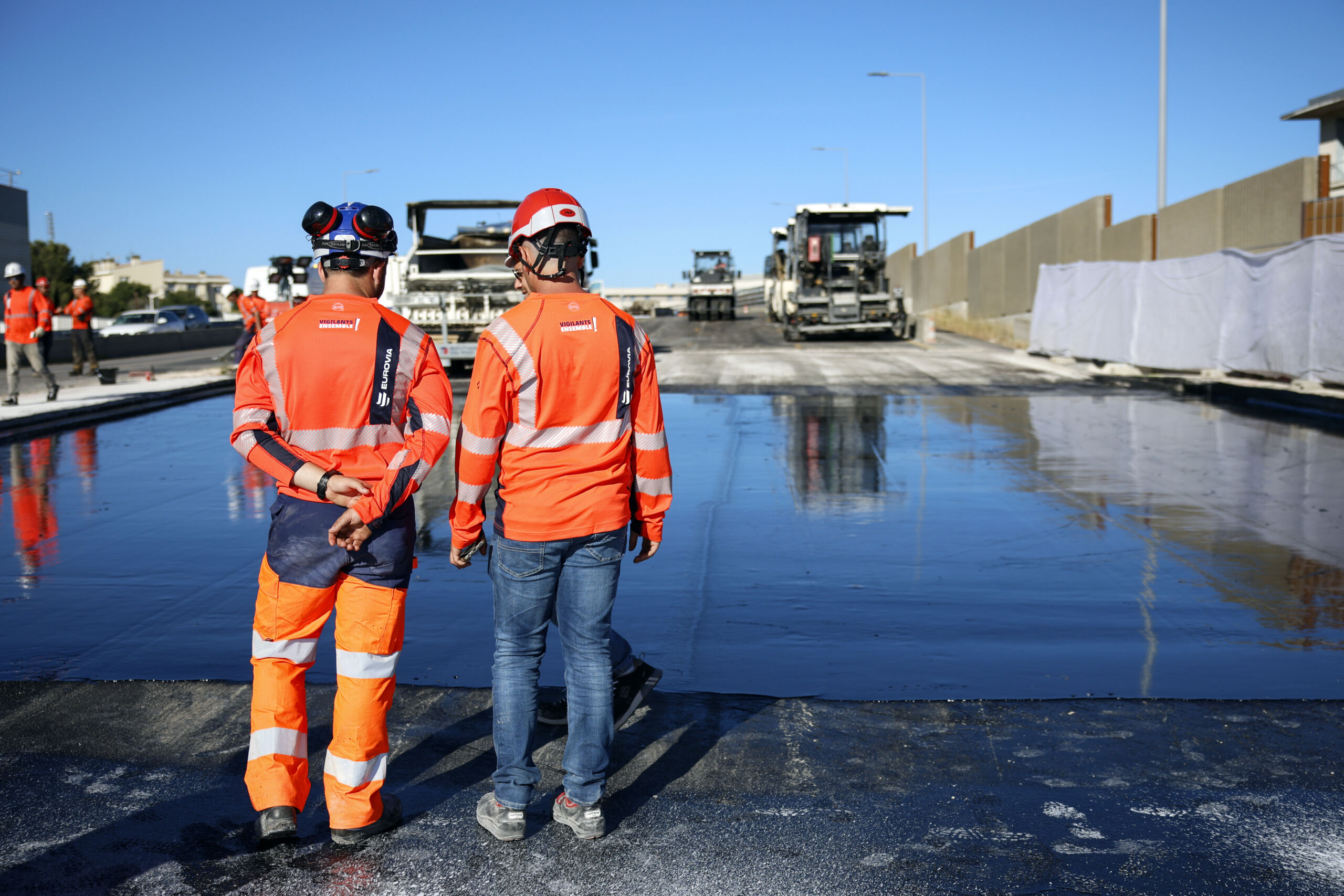 La première étape des travaux a consisté à décharger l’ouvrage en rabotant ses chaussées puis à hydro-décaper l’étanchéité existante pour retrouver le béton de l’ouvrage. Le reprofilage a ensuite été réalisé à l’aide de PROFILOVIA OA®, un béton bitumineux conçu pour reprofiler les ouvrages d’art. La solution Etanplast® a été utilisée pour réaliser la pose du complexe étanche avec une mise en œuvre entièrement mécanisée et à haute cadence. Une fois la couche d’étanchéité en place, les équipes ont pu mettre œuvre la dernière couche d’enrobé permettant la réouverture à la circulation dans les temps. L’opération a été réalisée en moins de 30h. En raison de la nature des produits utilisés, l’opération a été réalisée par temps sec et sans aucune circulation. L’agence Eurovia d’Aix-en-Provence, la Routière du Midi et le laboratoire DTE sont intervenus en renfort des équipes.