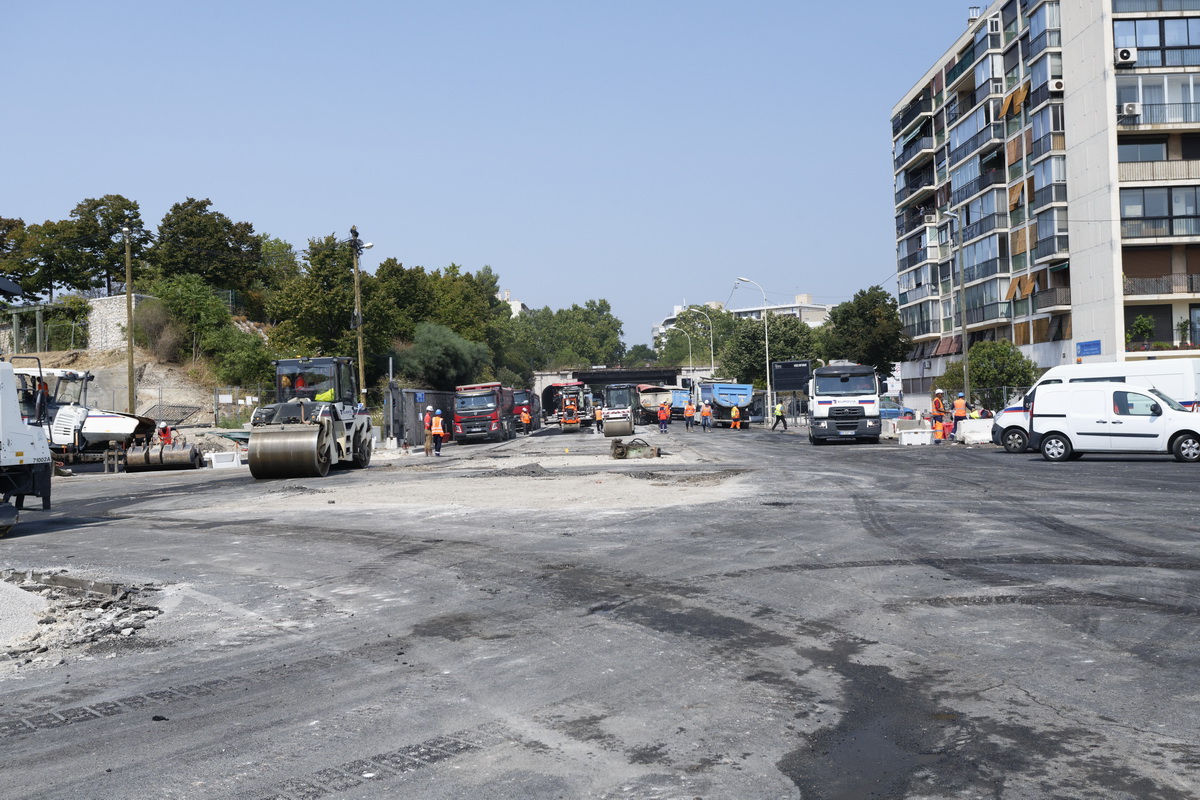 Le rétablissement des chaussées a été confiée au groupement Eurovia Marseille (mandataire)/Eiffage Route. Les équipes ont réalisé les couches de forme, de base et de roulement en 13 h de temps, en lieu et place de l’ancienne passerelle. Trois équipes travaux et deux usines d’enrobés ont été mobilisées. En terminant avec 2h d’avance sur l’objectif fixé, les équipes ont grandement participé à l’ouverture en temps et en heure du carrefour, et ce malgré quelques aléas de chantier.