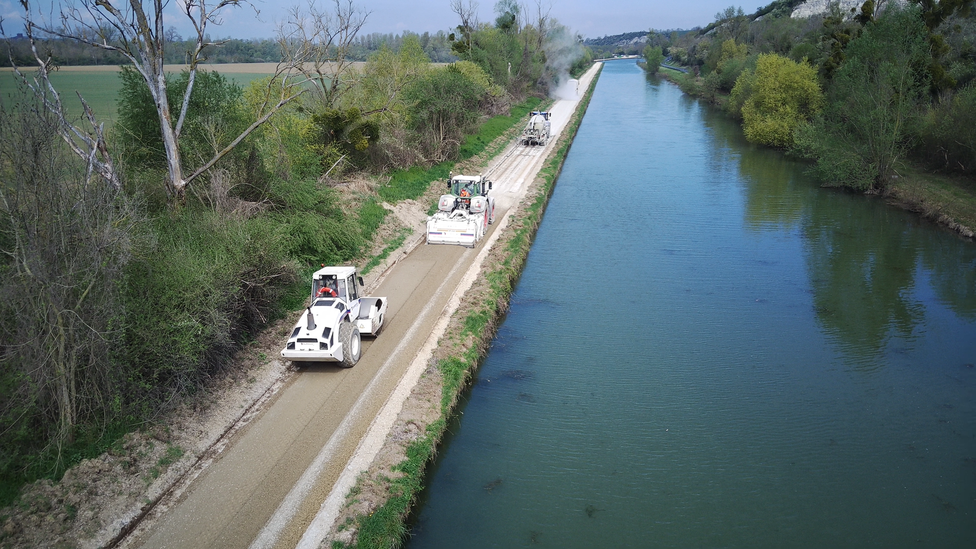 L’agence Eurovia de Vitry – Saint-Dizier a réalisé – du 15 mars 2022 au 7 avril 2023 – les travaux de raccordement de cette section à la véloroute 52. Les équipes ont notamment créé 9 aires de repos avec des parkings infiltrants en dalle gazon et réalisé la réfection de 13 ouvrages de franchissement en posant 1 330 ml de garde-corps. Le traitement des sols a été réalisé en place sur 23 km et à l’aide de l’atelier de traitement de sol de l’agence. 2 types de voiries ont été mises en œuvre sur la véloroute à savoir une voirie lourde constituée d’un revêtement en grave bitume et une voirie légère en BBS/BBSG avec une formule spécialement conçue pour les pistes cyclables. Les 2 revêtements utilisés comportaient chacun 40 % d’agrégats d’enrobés recyclés. Enfin, une partie de la véloroute étant bordée de platanes centenaires, un soin minutieux a été nécessaire afin de réaliser les travaux en ne faisant aucune lésion aux platanes. Une finition en sable stabilisé a été appliquée. Le réseau de fibre optique longeant le chantier sur 20 km, 15 jours de sondage manuel ont été nécessaire pour détecter et valider le tracé du réseau.