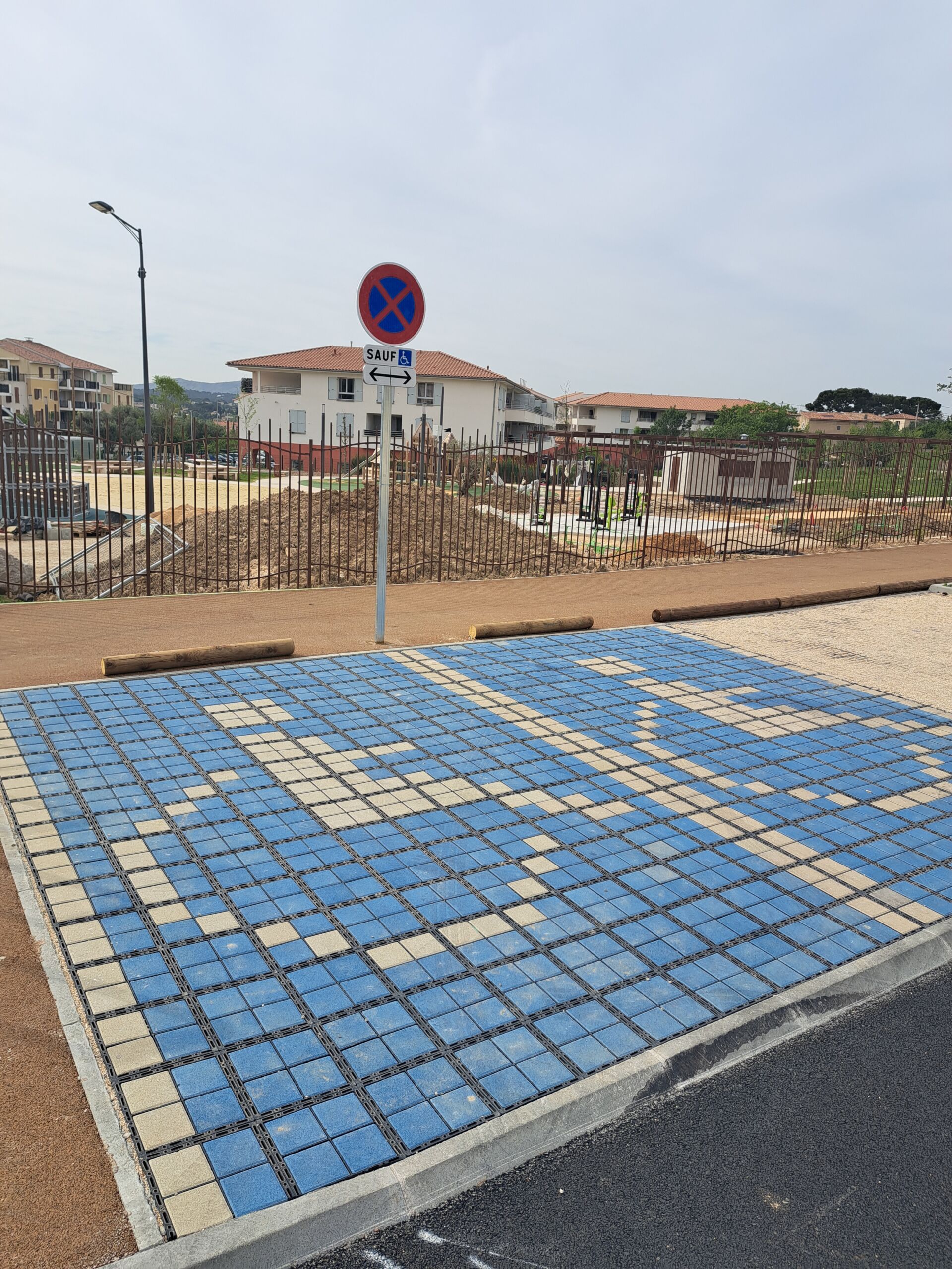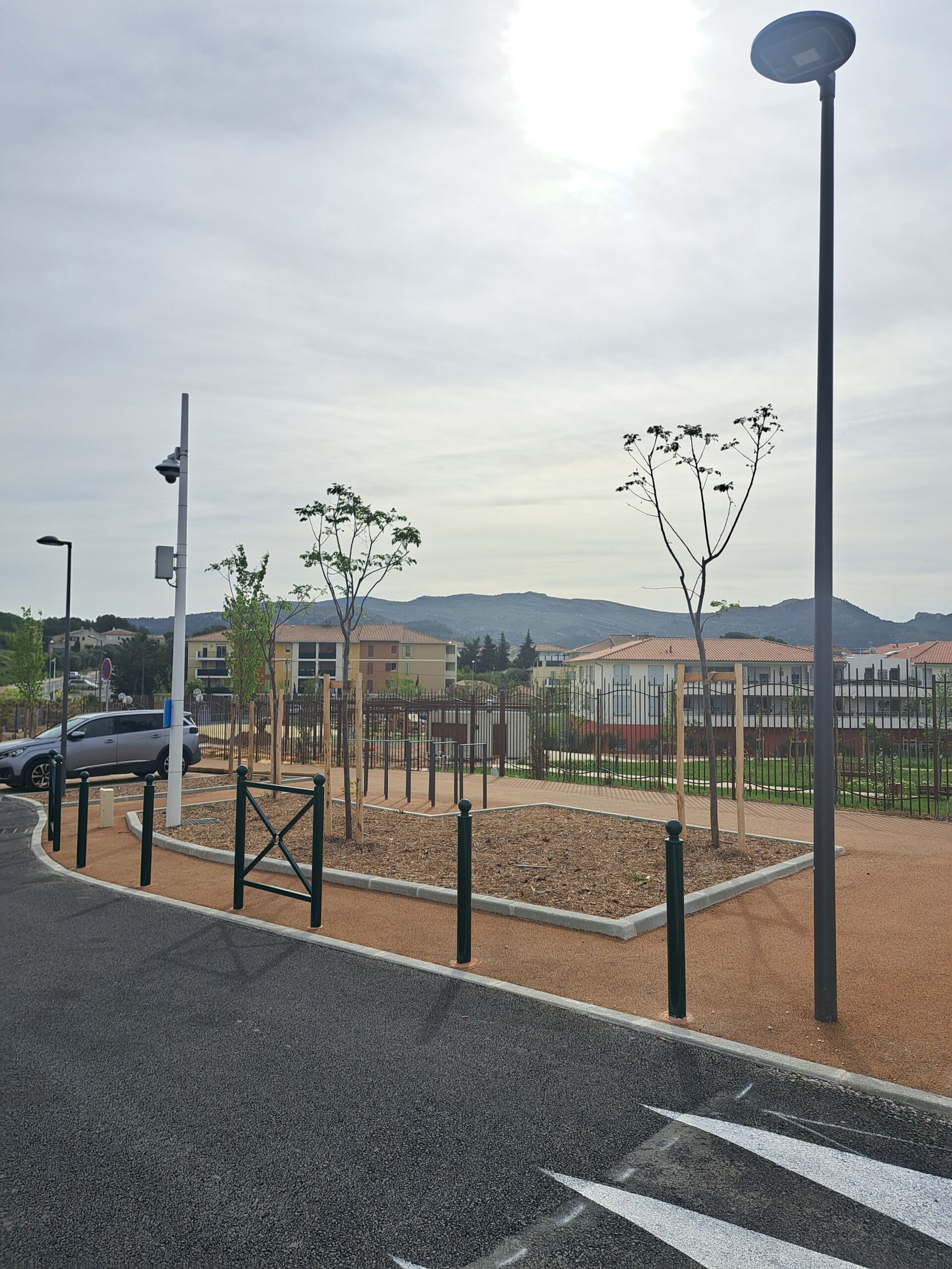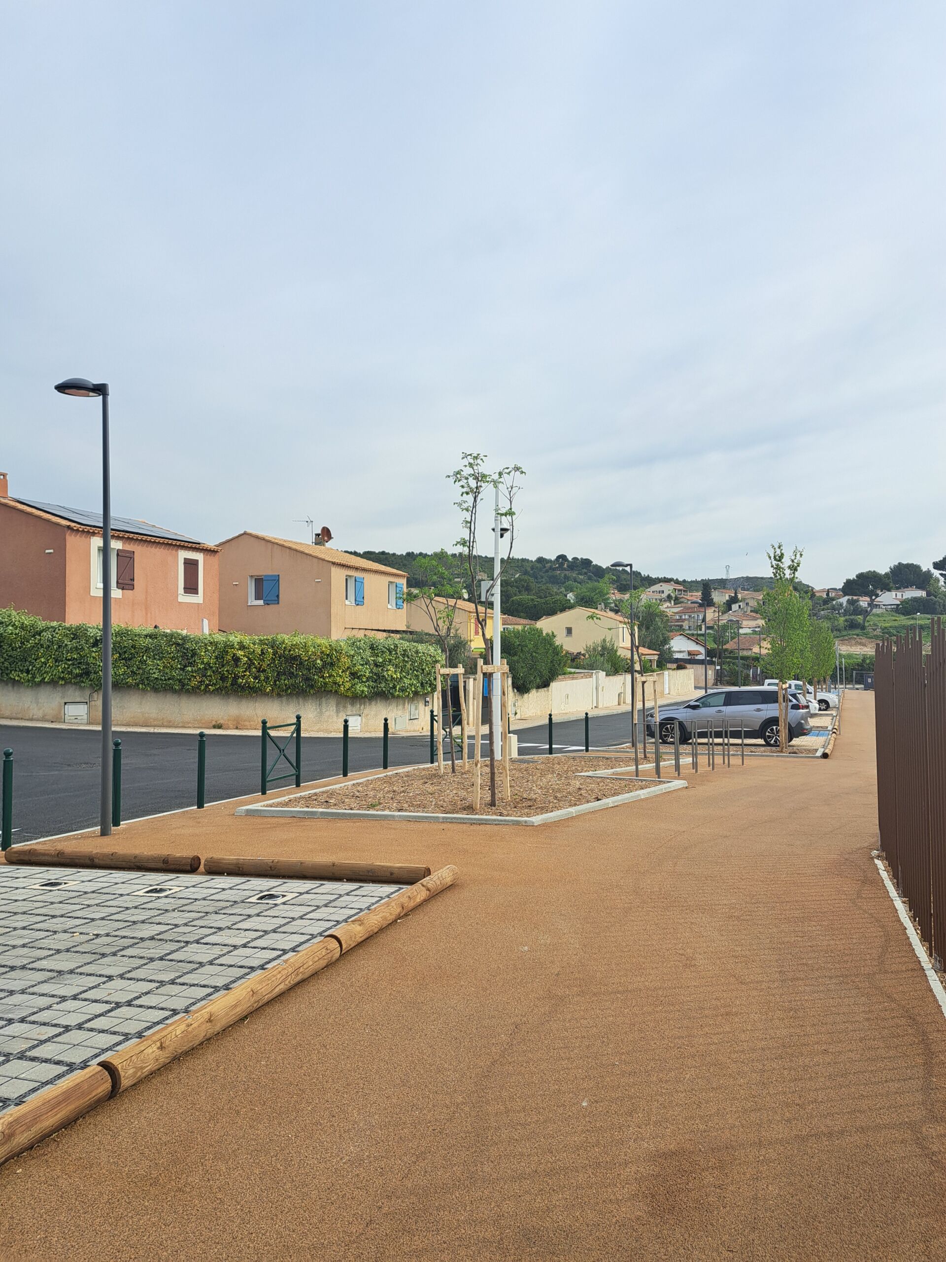 Des travaux préalables ont ainsi été menés afin de d’aménager, sur la rue André Bailet, un parking le long du parc et un espace dédié aux mobilités douces. L’agence Eurovia de Marseille réalise, depuis novembre 2023 et jusqu’à fin février 2024, le lot de voiries et réseaux divers. Afin de faciliter l’infiltration des eaux pluviales et de rafraichir les espaces, des enrobés perméables ont été mis en œuvre sur la voie partagée entre les piétons et les cyclistes et des dalles alvéolaires en béton constituent le parking.