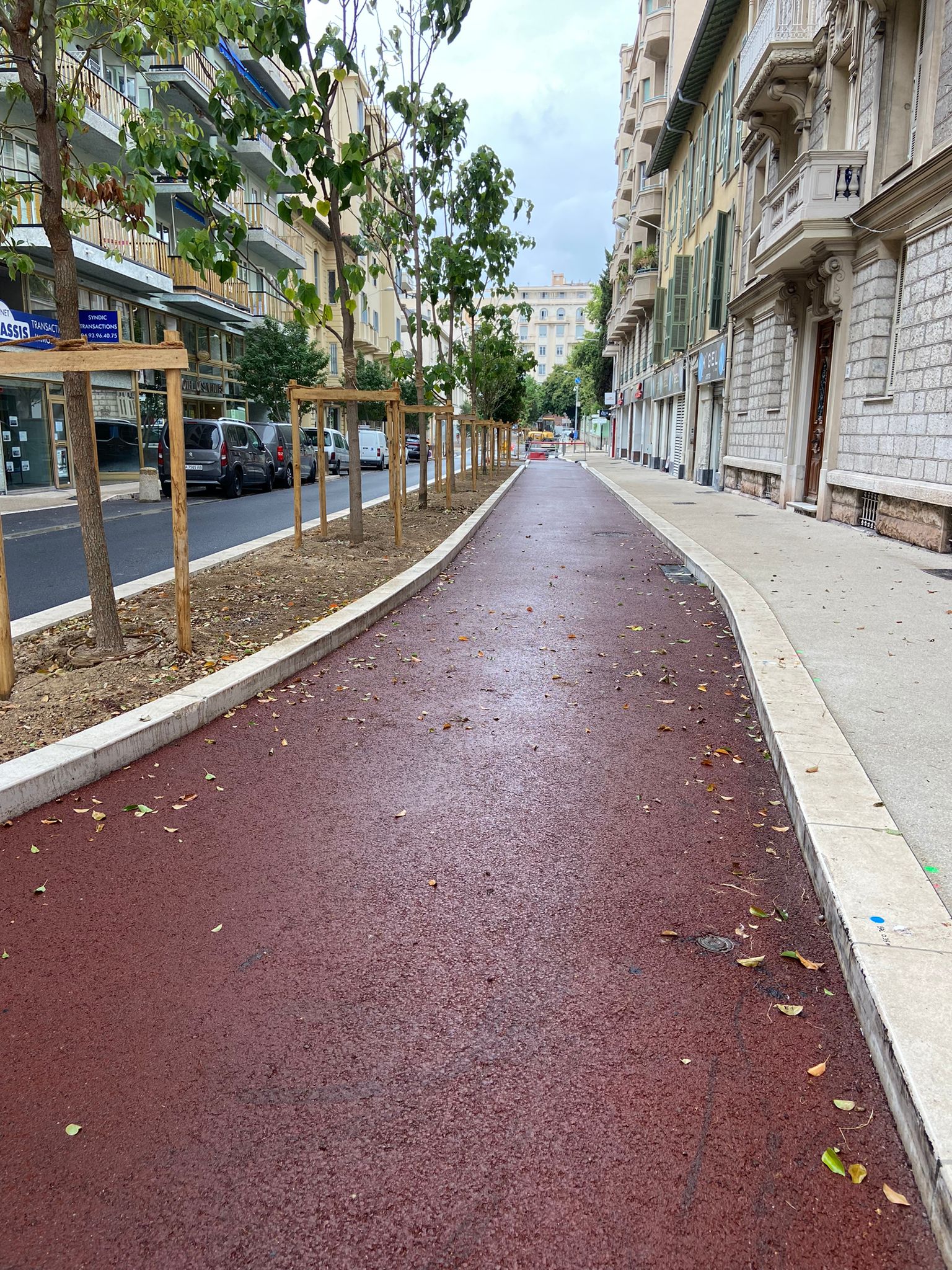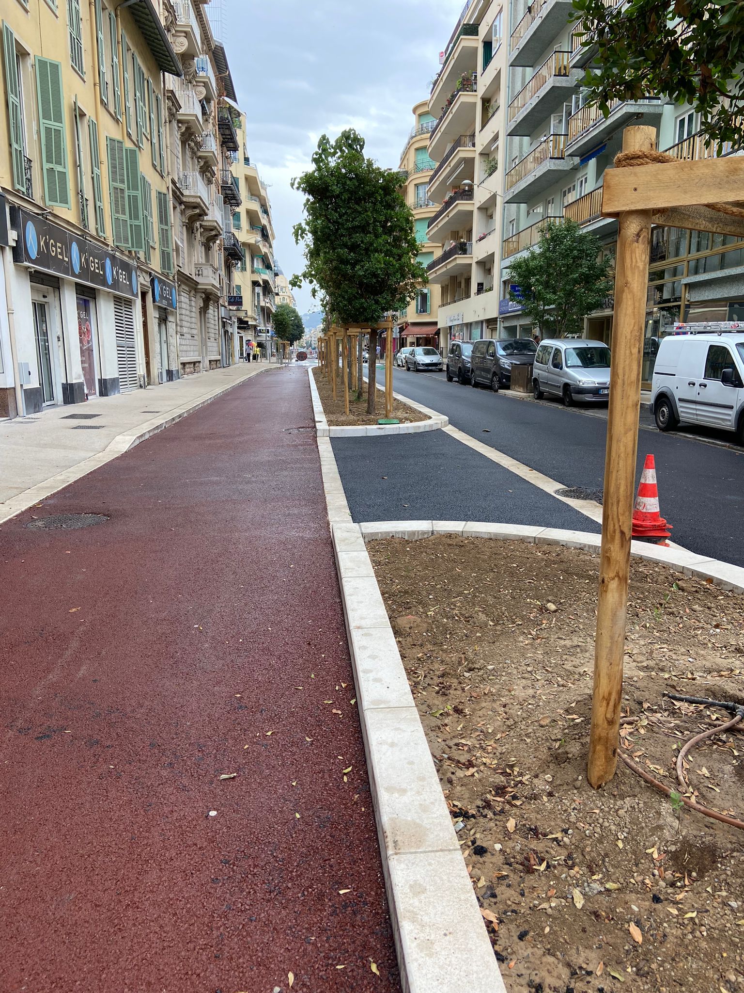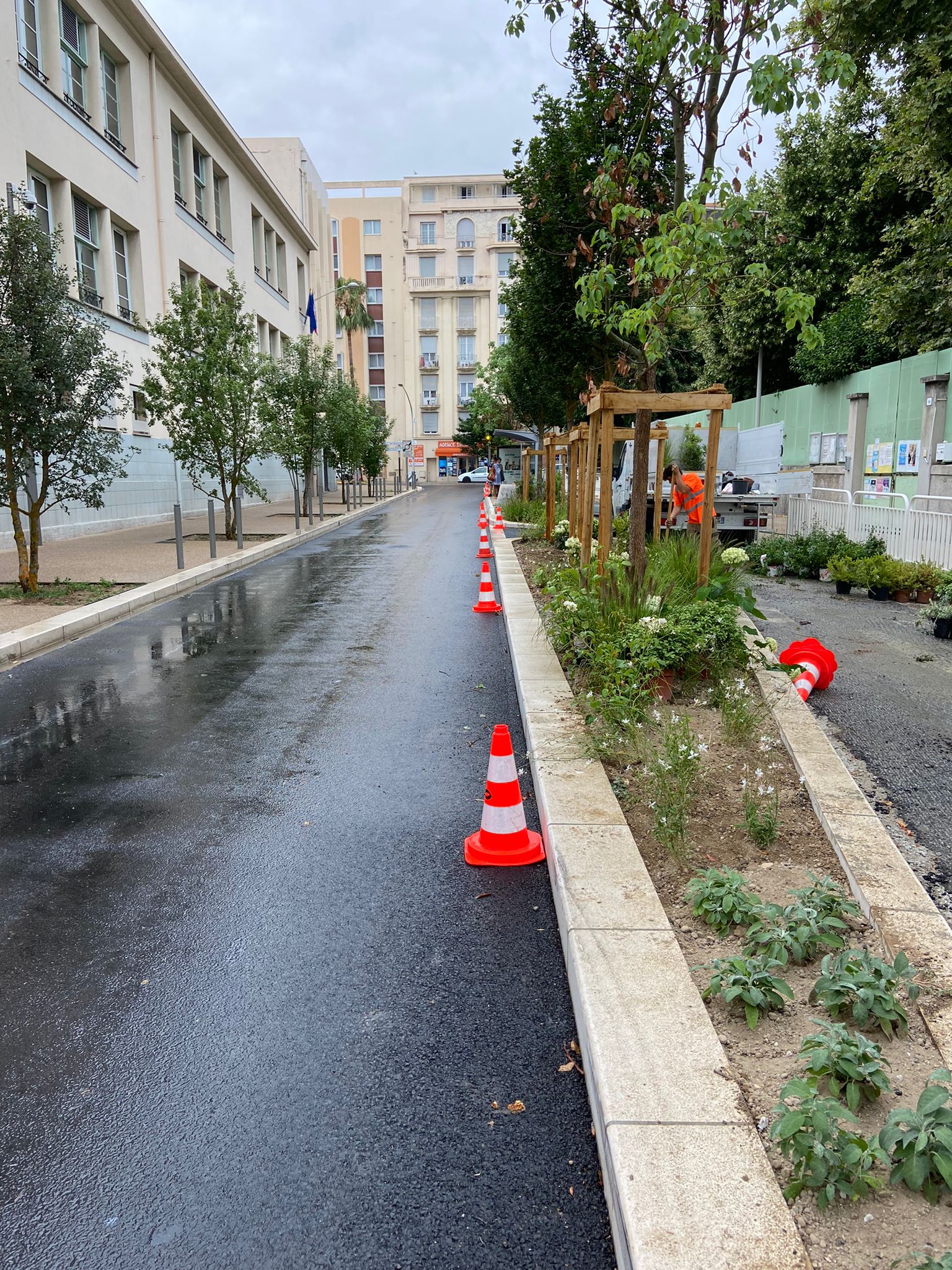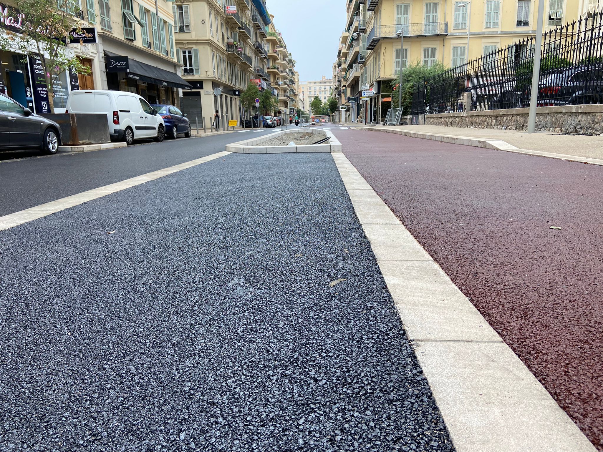 Les équipes réalisent donc les travaux de démolition, de terrassements et de réseaux, la création de voiries, la mise en place de bordures et finalement la pose de mobiliers et la création d’espaces verts. La totalité du réseau en eau potable a été refait sur tout le linéaire du chantier. Afin de garantir la sécurité des usagers, les pistes cyclables sont créées en enrobés rouges afin de les distinguer de la chaussée.