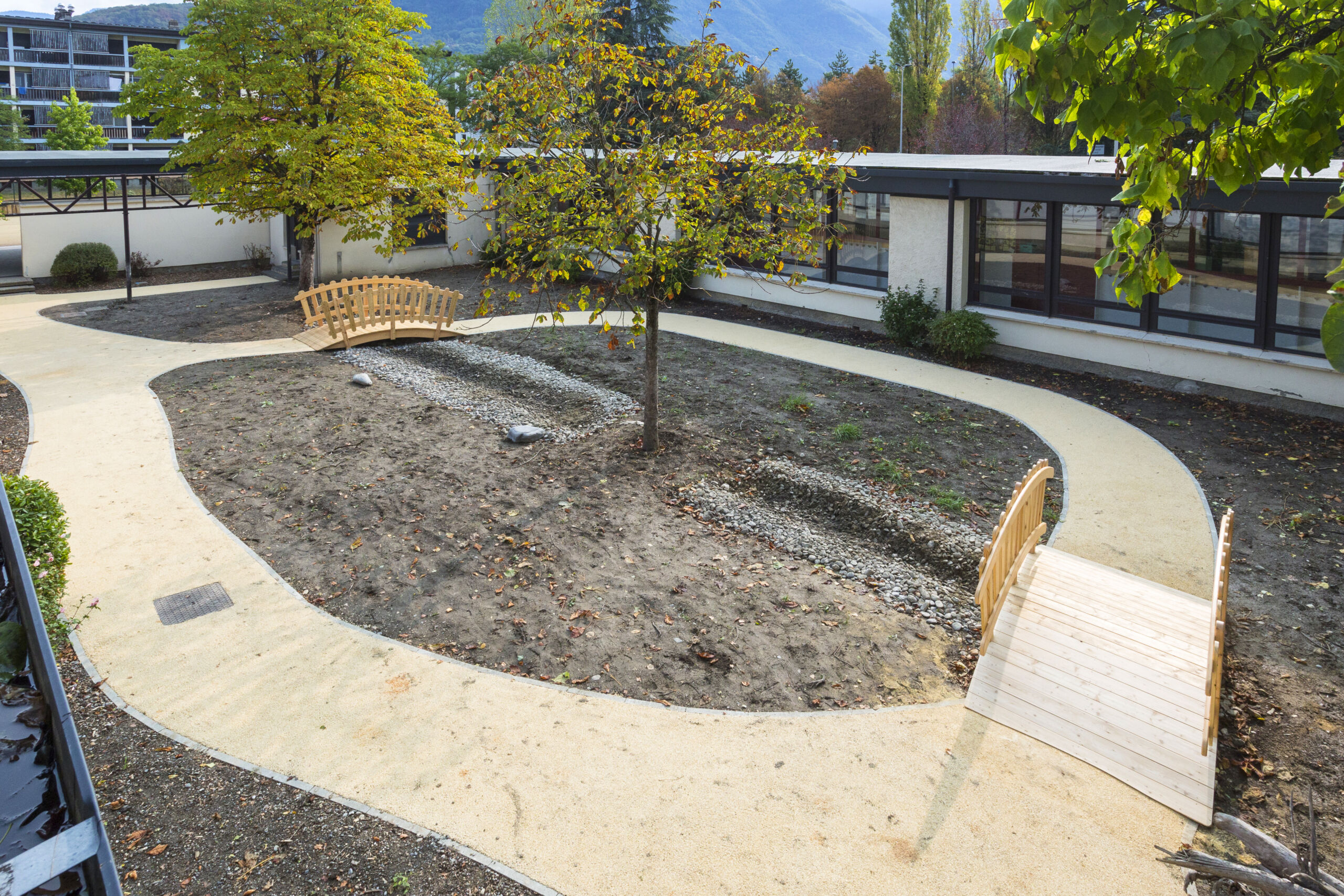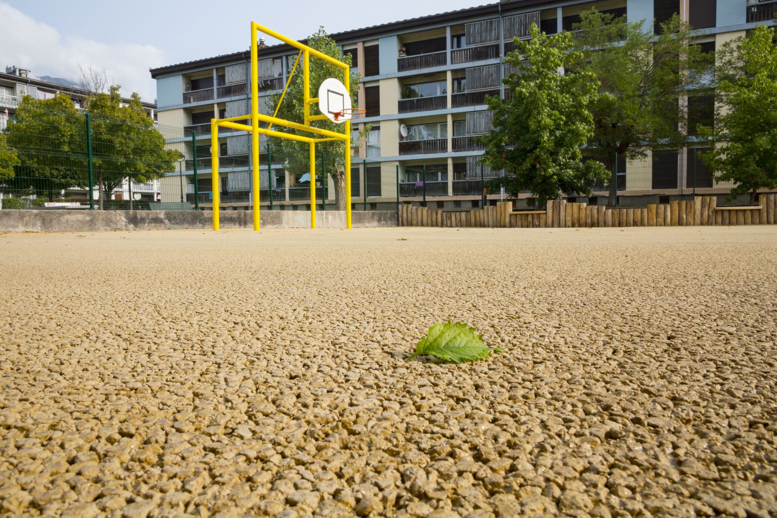 L’agence Eurovia d’Albertville est ainsi intervenue, de juillet à août 2023, afin de rénover la cour de l’école élémentaire Martin Sibille, située au Sud d’Albertville (73). Les équipes ont réalisé les travaux de désimperméabilisation des surfaces et ont mis en œuvre l’enrobé Decovia®. Sa couleur claire, sa fabrication à froid et sa formule drainante permettent de rafraichir les espaces et ainsi de contribuer à créer des ilots de fraîcheur urbain. Une noue paysagère a été créée afin de faciliter la circulation de l’eau. Des arbres ont été plantés ; la terre et le bois ont été privilégiés pour aménager l’espace. Revêtements, Eau, Sol et Végétal, les 4 leviers de l’offre Revilo® ont été utilisés sur ce projet de rénovation.