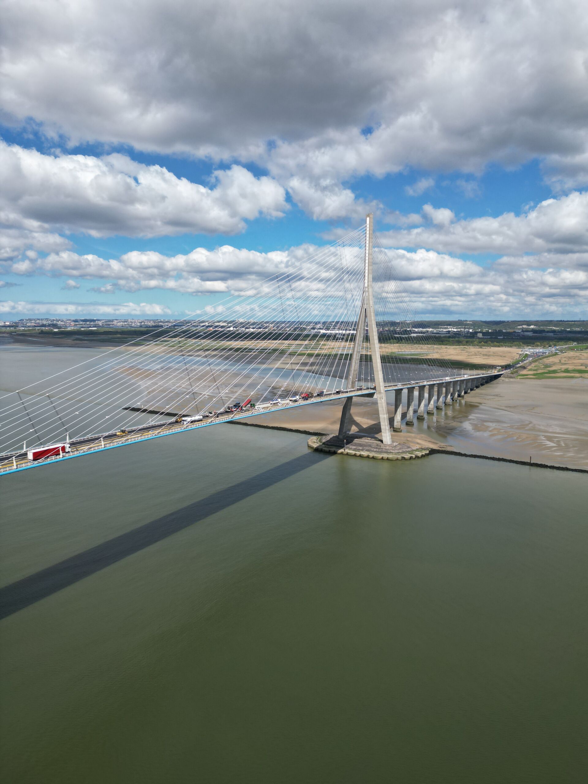 Symbole de l’union entre la Basse-Normandie et la Haute-Normandie, le Pont de Normandie enjambe l’estuaire de la Seine et relie Honfleur (14) et Rogerville (76). Des travaux ont été réalisés de mars à septembre 2024 afin de rénover les chaussées du pont et les étanchéités des ouvrages. Mandataire du marché de travaux, l’agence ViaFrance de Saint-Etienne-du-Rouvray procède au rabotage des chaussées, à la mise en œuvre des complexes d’étanchéité haute cadence Orthoplast® ( pour les tabliers métalliques) et Etanplast® pour les tabliers béton et à la mise en œuvre de nouveaux enrobés. L’agence Eurovia d’Aubervilliers a réalisé les travaux d’étanchéité par feuille du reste des ouvrages métalliques. Les agences Eurovia du Havre et de Dieppe sont également intervenus en renfort afin de mettre à disposition leurs équipes et leur matériel pour mener à bien ce chantier. Les agences de ViaFrance Val de Reuil et EJL de Woippy ont mis à disposition leurs répandeuses thermofluides pour les étapes cruciales de ces travaux. Les industries LRBS et Normandie Enrobés ainsi que la carrière de Rouperoux ont fourni et réalisé 23 000 tonnes d’enrobés et revalorisé tout autant de fraisats.
