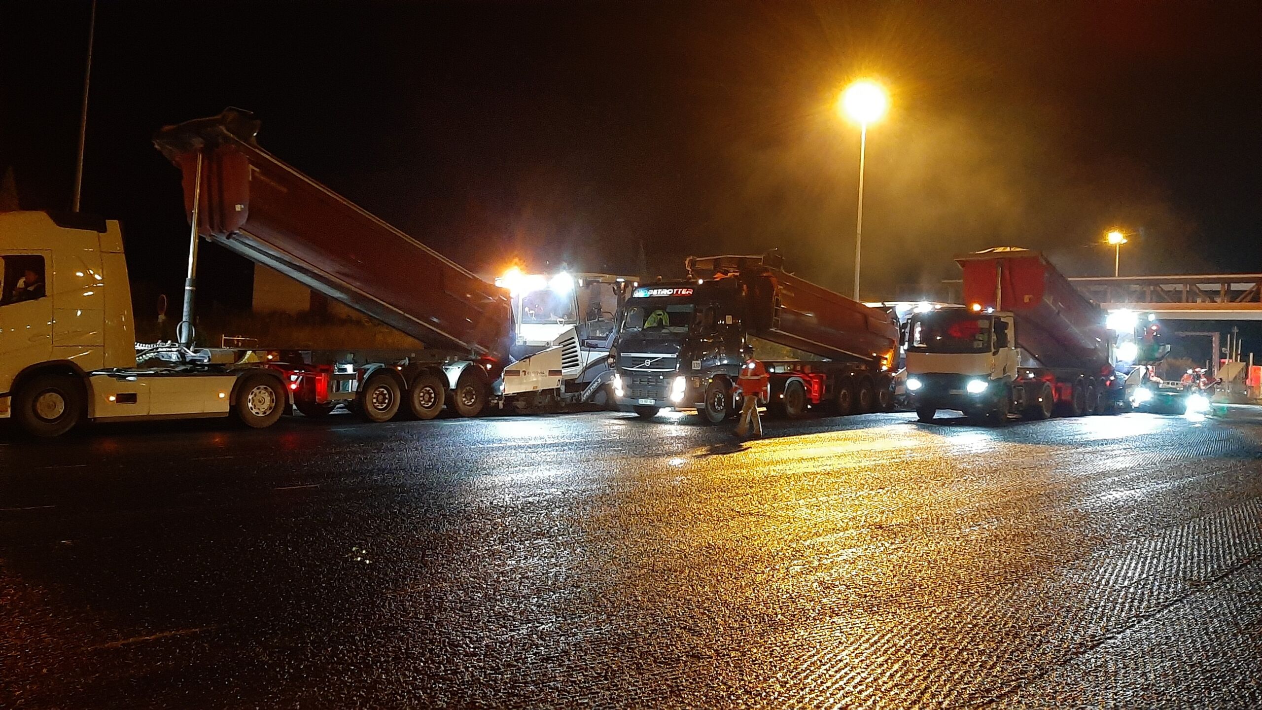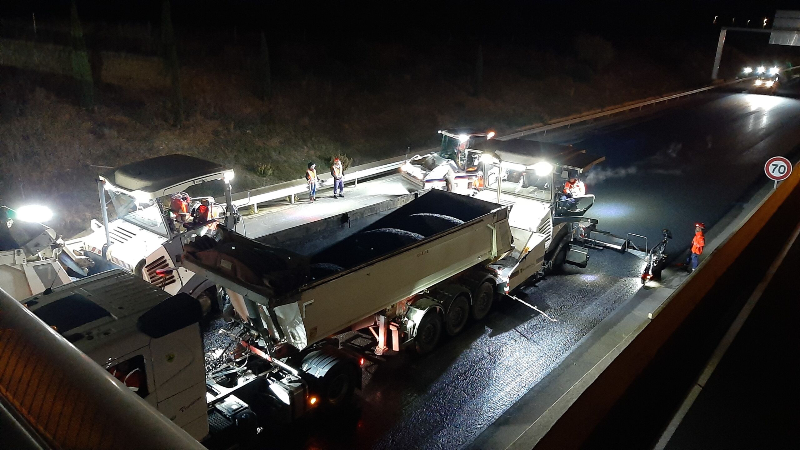 Afin de limiter l’impact sur la circulation, le phasage de ce chantier a été optimisé. Les travaux se sont donc déroulés de 22h à 5h pendant 14 nuits et ont mobilisé en moyenne 60 personnes par nuit. L’application des enrobés a elle aussi été optimisée grâce à des finisseurs ayant couvert jusqu’à 16 ml de large.