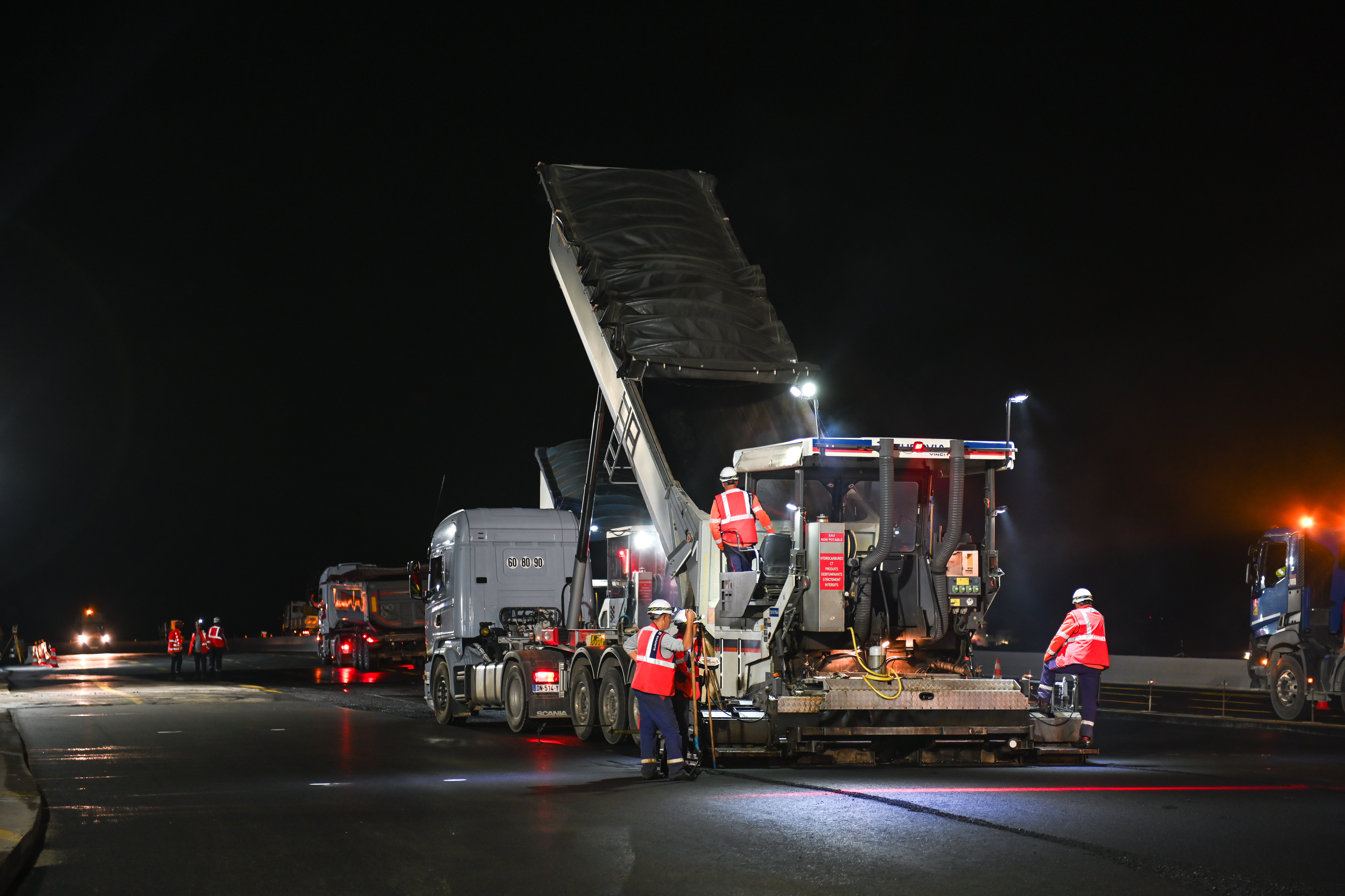 La 1e phase de travaux – réalisée en 2022 – consistait aux travaux permettant la déviation provisoire du trafic de l’A7 pour permettre la démolition et reconstruction de l’ouvrage. Les équipes de l’agence Eurovia d’Aubenas ont réalisé les couches d’assise et de roulement du pont provisoire en seulement 12 nuits.