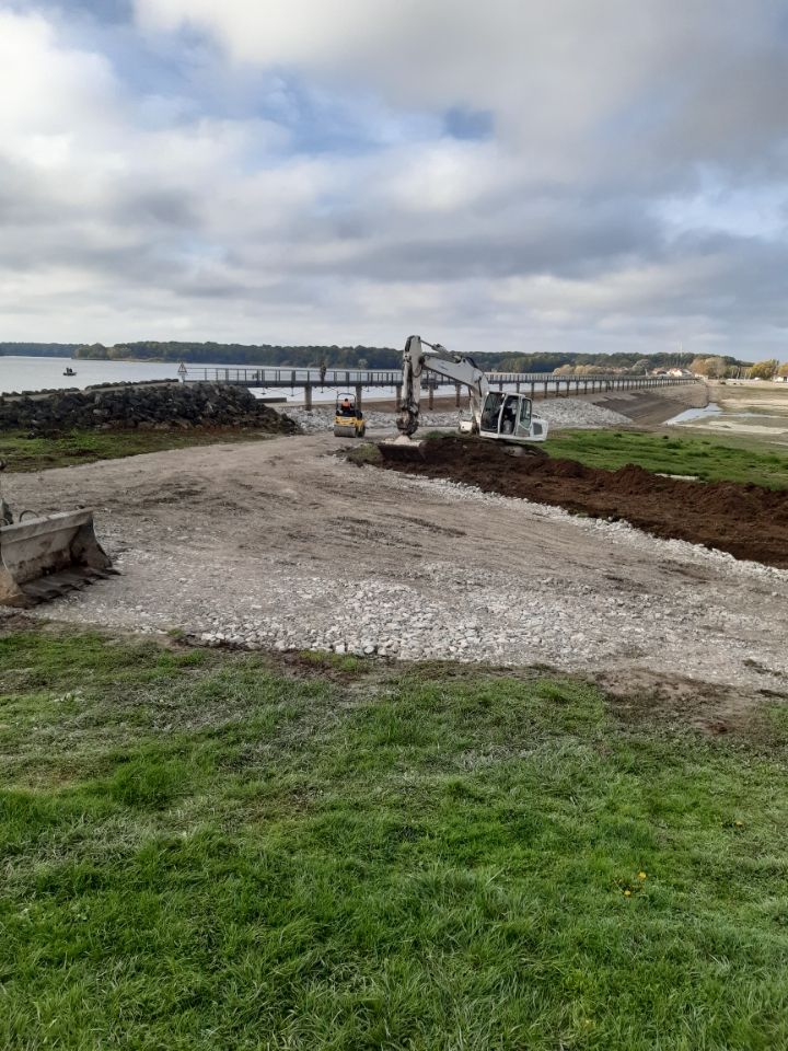Dans le cadre du marché de travaux d’entretien de l’EPTB – Etablissement Public Territorial de Bassin –, les équipes de l’agence Eurovia de Vitry ont profité de la période annuelle basse du Lac du Der afin de réaliser les travaux de renforcement de la digue de Rougemer, passerelle entre les communes de Giffaumont (51) et de Braucourt (52).
