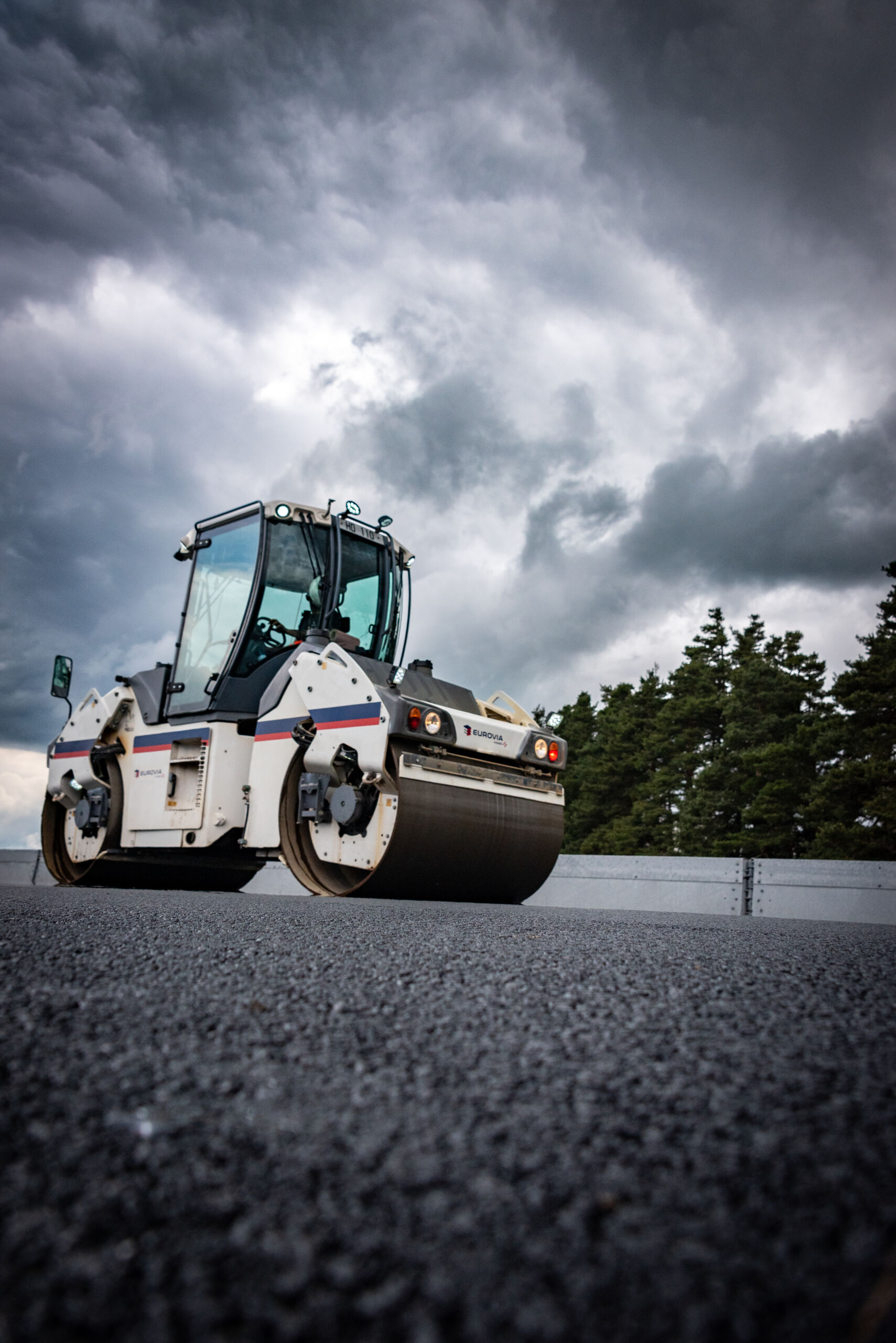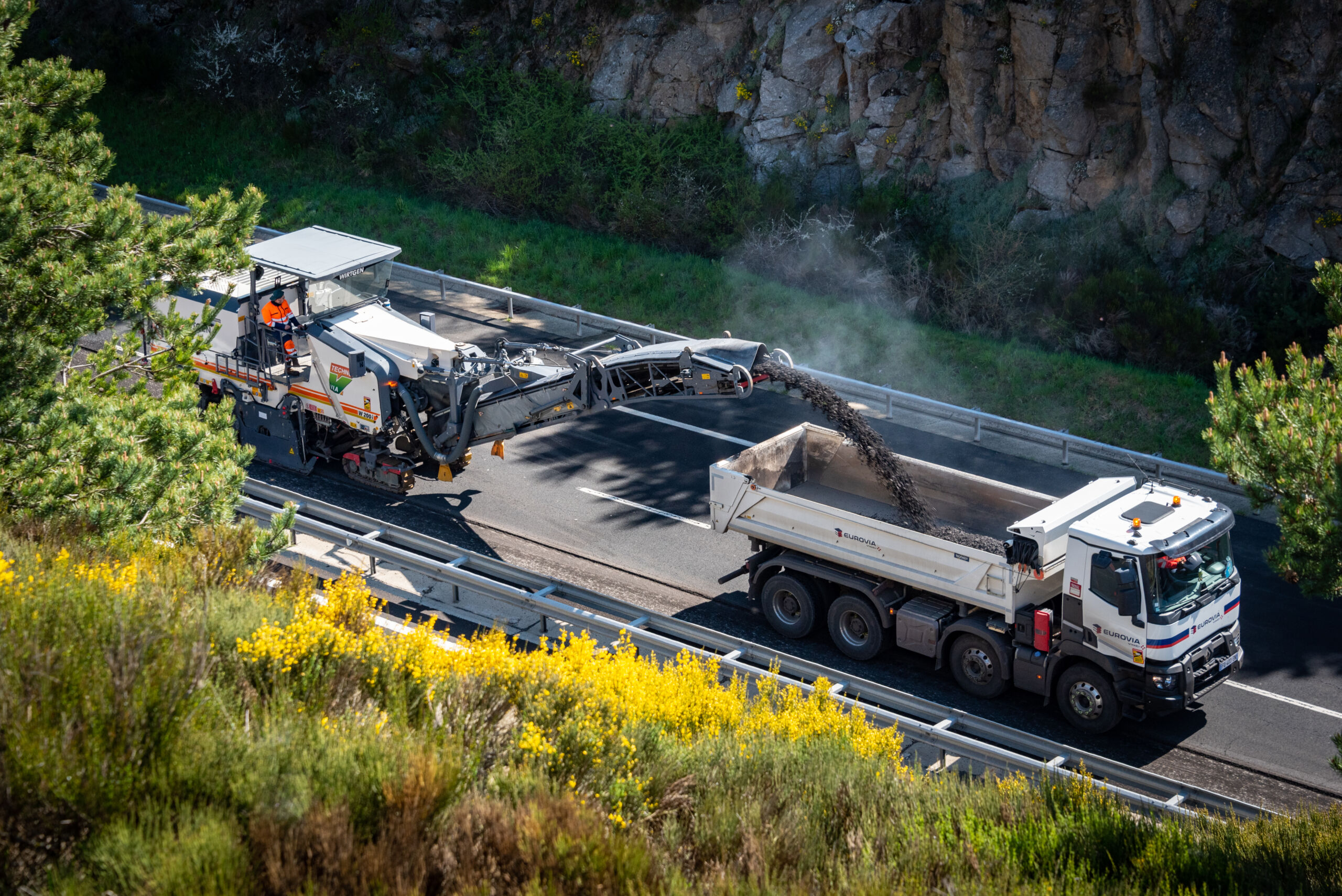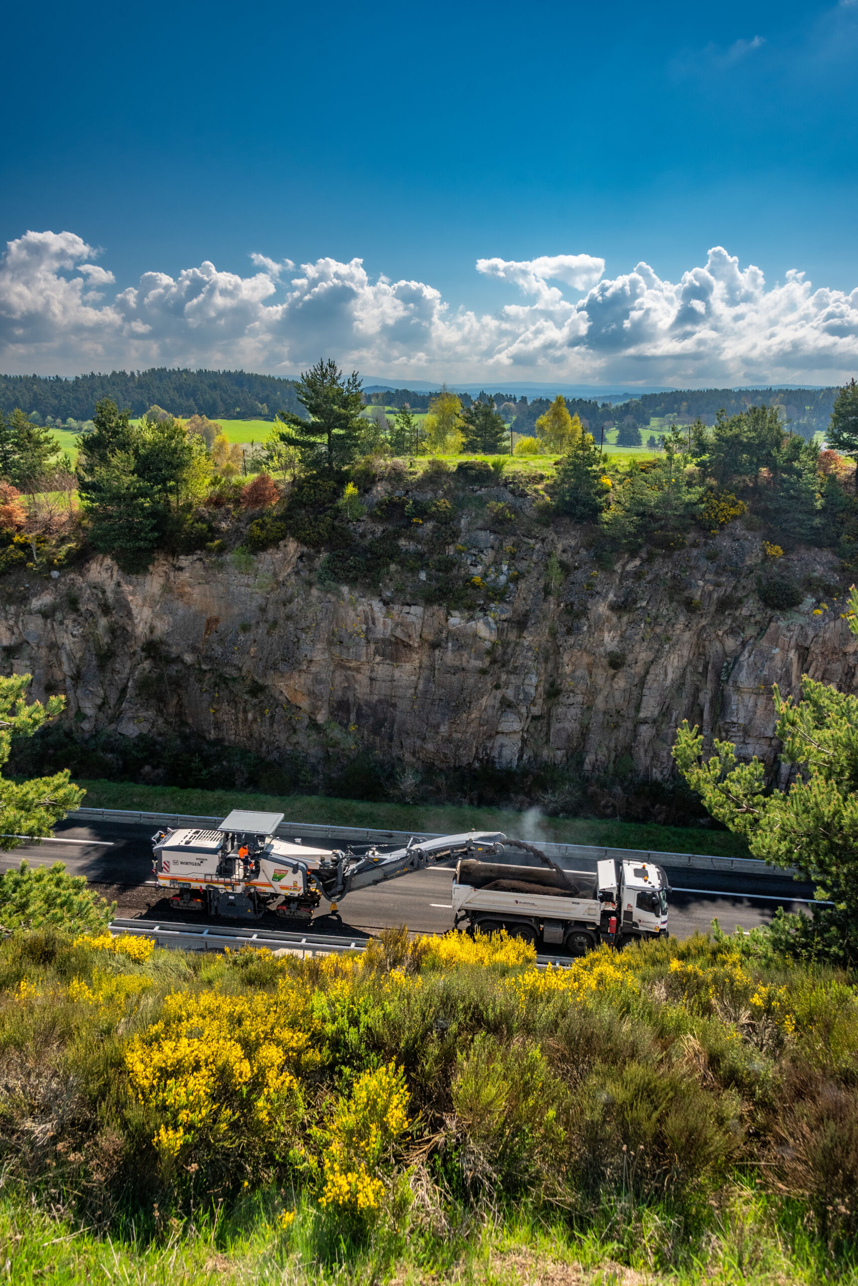 Réalisés à proximité de la commune d’Aumont-Aubrac (48), les travaux ont consisté à raboter les enrobés de la chaussée et à les remplacer par de nouveaux enrobés contenant 10 % d’agrégats d’enrobés. 3 finisseurs – positionnés côte à côté – ont permis d’appliquer les nouveaux enrobés en une seule fois sur la bande de gauche, sur les 2 voies de roulement et sur la bande d’arrêt d’urgence.