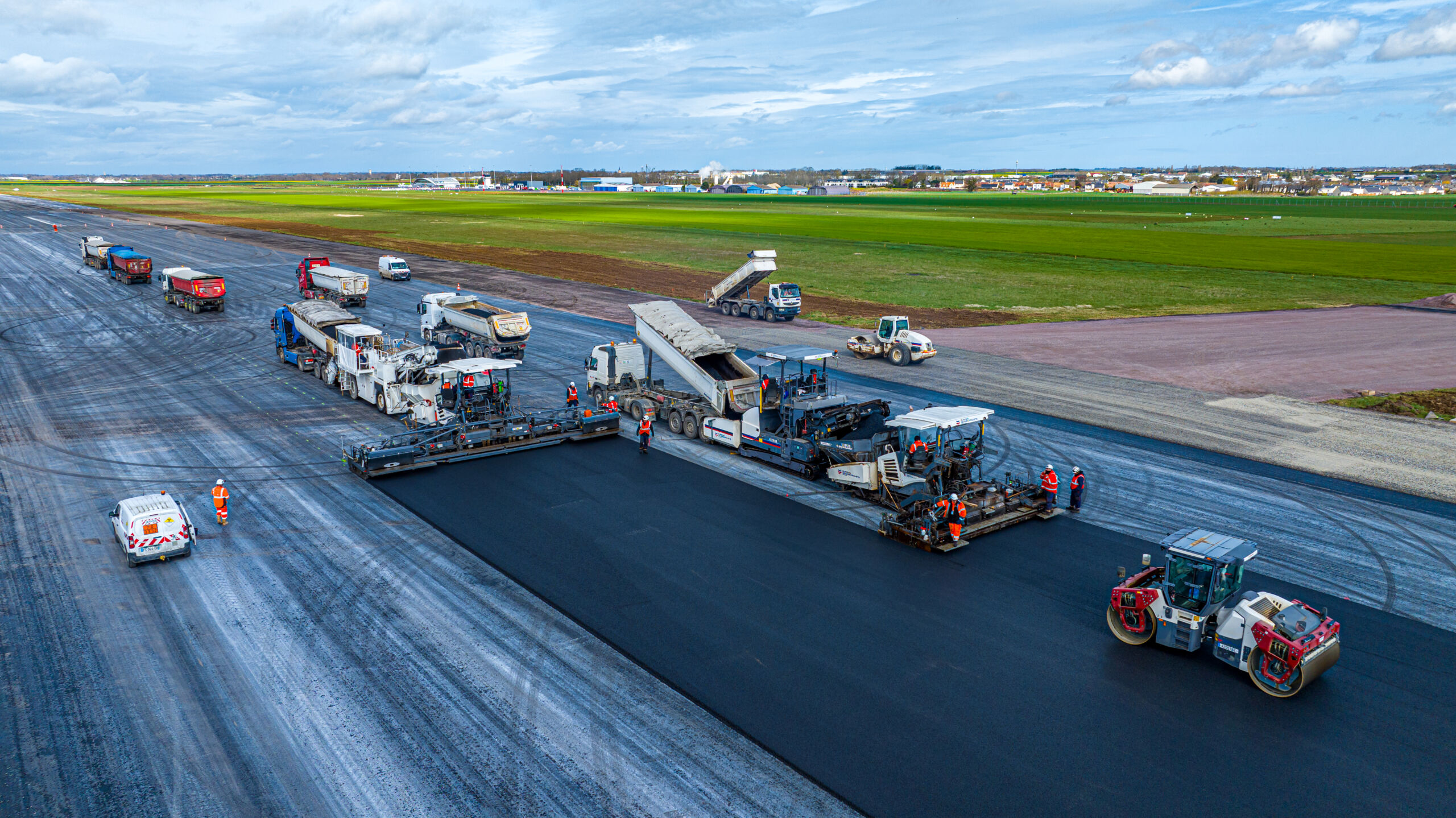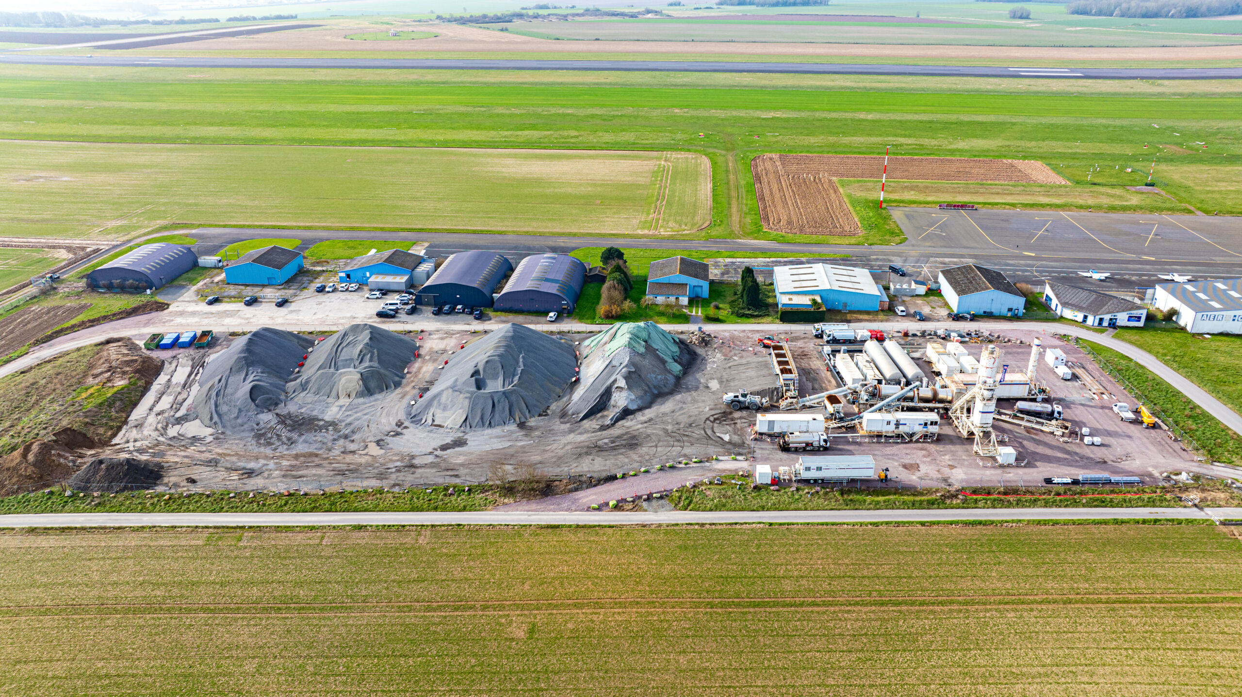 Le groupement composé de l’agence Eurovia de Caen (mandataire), d’Eurovia Grands Projets France et de SIGNATURE Nord est intervenu, du 11 mars au 18 avril 2024, sur le lot 1 visant à mettre aux normes la piste principale et la rampe d’approche. Les équipes ont d’abord raboté les enrobés de la piste et réalisé les travaux de terrassement des zones de purge. La piste a ensuite été reprofilée, en long afin d’adoucir le rayon de courbure et en travers pour respecter les normes de conformités de l’EASA (European Union Aviation Safety Agency). Ce reprofilage a été réalisé à l’aide de grave bitume et d’enrobés à module élevé. Des BBSG et BBA ont été mis en œuvre en couche de roulement et pour les accotements. 24 000 tonnes de granulats provenant de la carrière GBN et 4 300 m3 de granulats provenant de SNEH (toutes deux filiales de VINCI Construction) ont été utilisés. SIGNATURE Nord est ensuite intervenu pour réaliser le marquage de la piste.