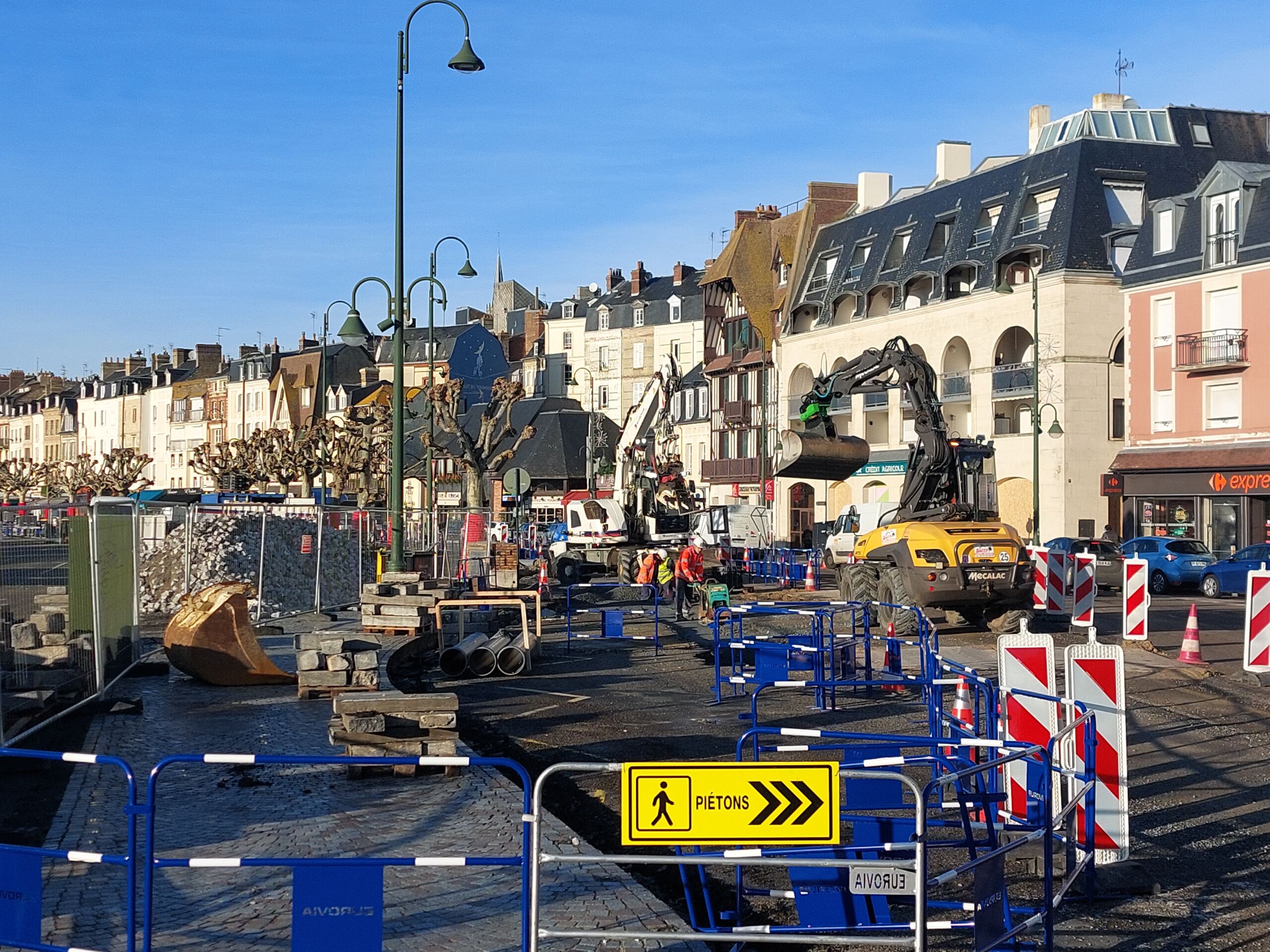 L’agence Eurovia de Caen intervient du 8 novembre 2023 au 31 décembre 2024 afin de créer les tranchées souples et réseaux d’évacuation des eaux pluviales, de réaliser les voiries, de poser des pavés granit sur les trottoirs et de mettre en œuvre des enrobés beiges pour créer les pistes cyclables.