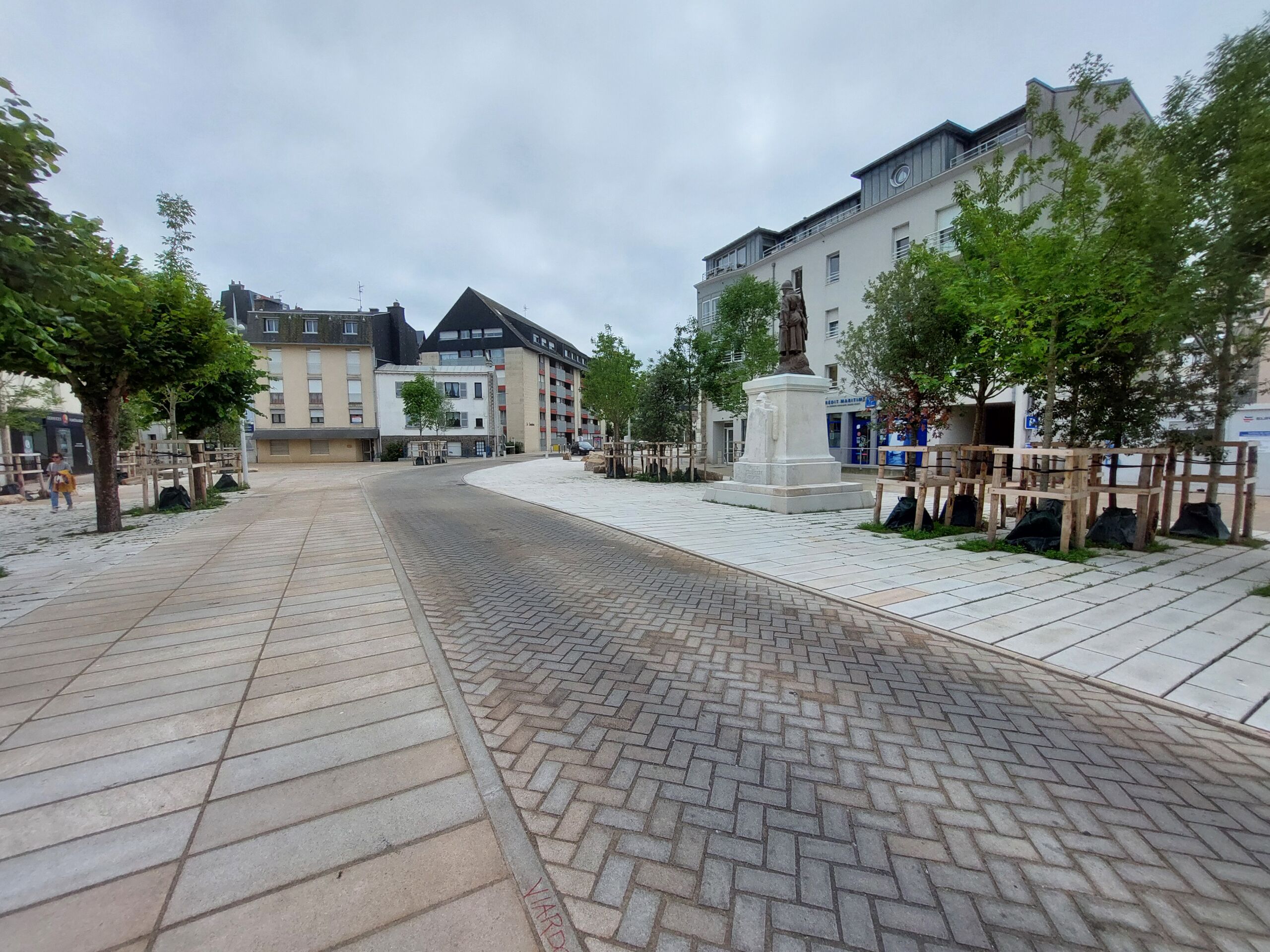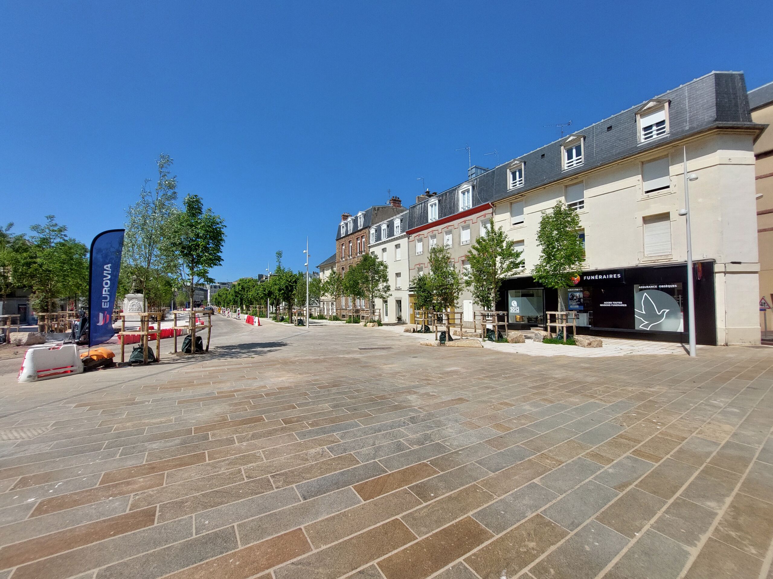 Au total, ce sont 16 500 m² de surfaces de chantier qui ont été traités. Les équipes ont d’abord réalisé l’ensemble des travaux préparatoires : préparation du terrain, dépose des panneaux de signalisation, terrassements, création de structures adaptées au dallage et au pavage, ainsi que le déplacement du monument aux morts.