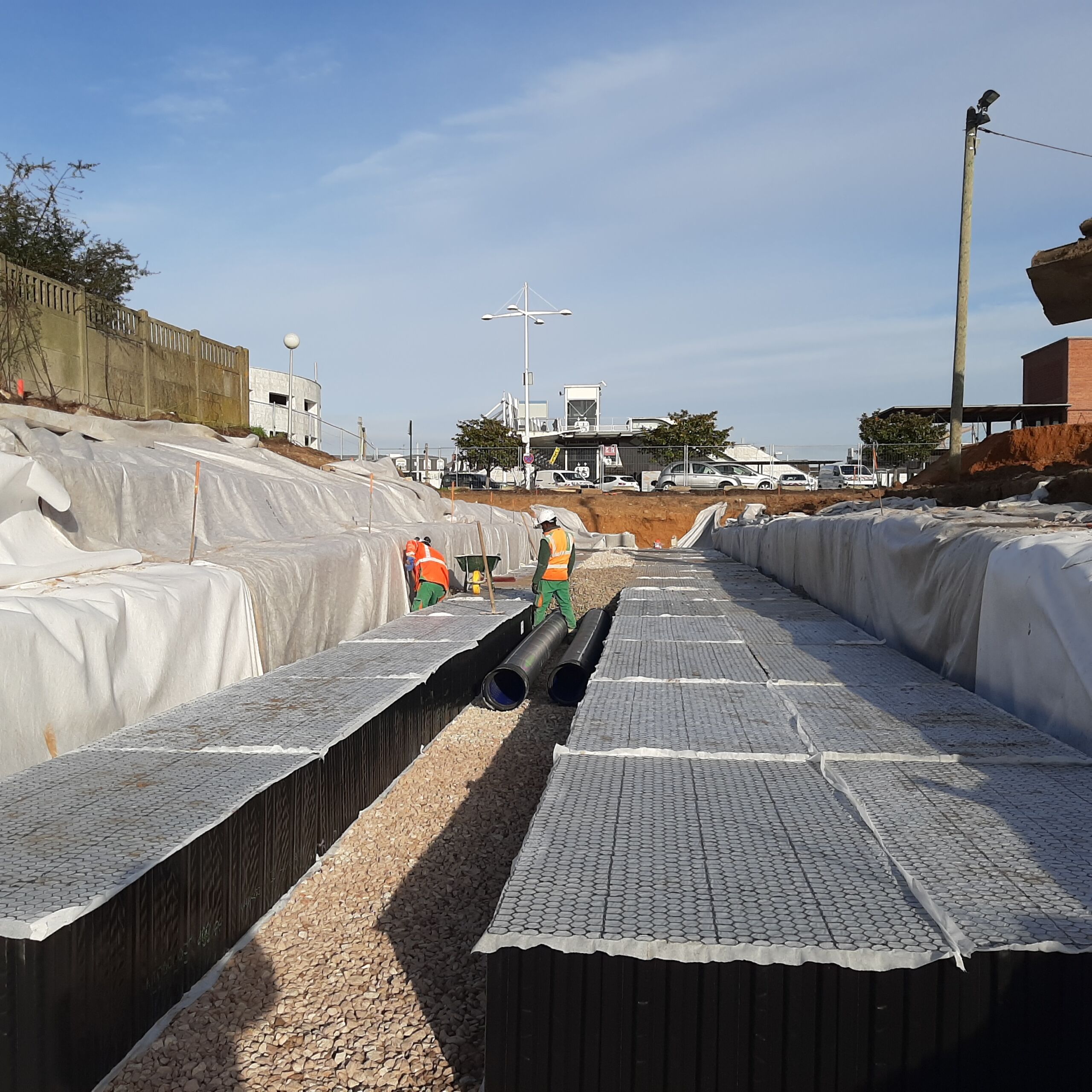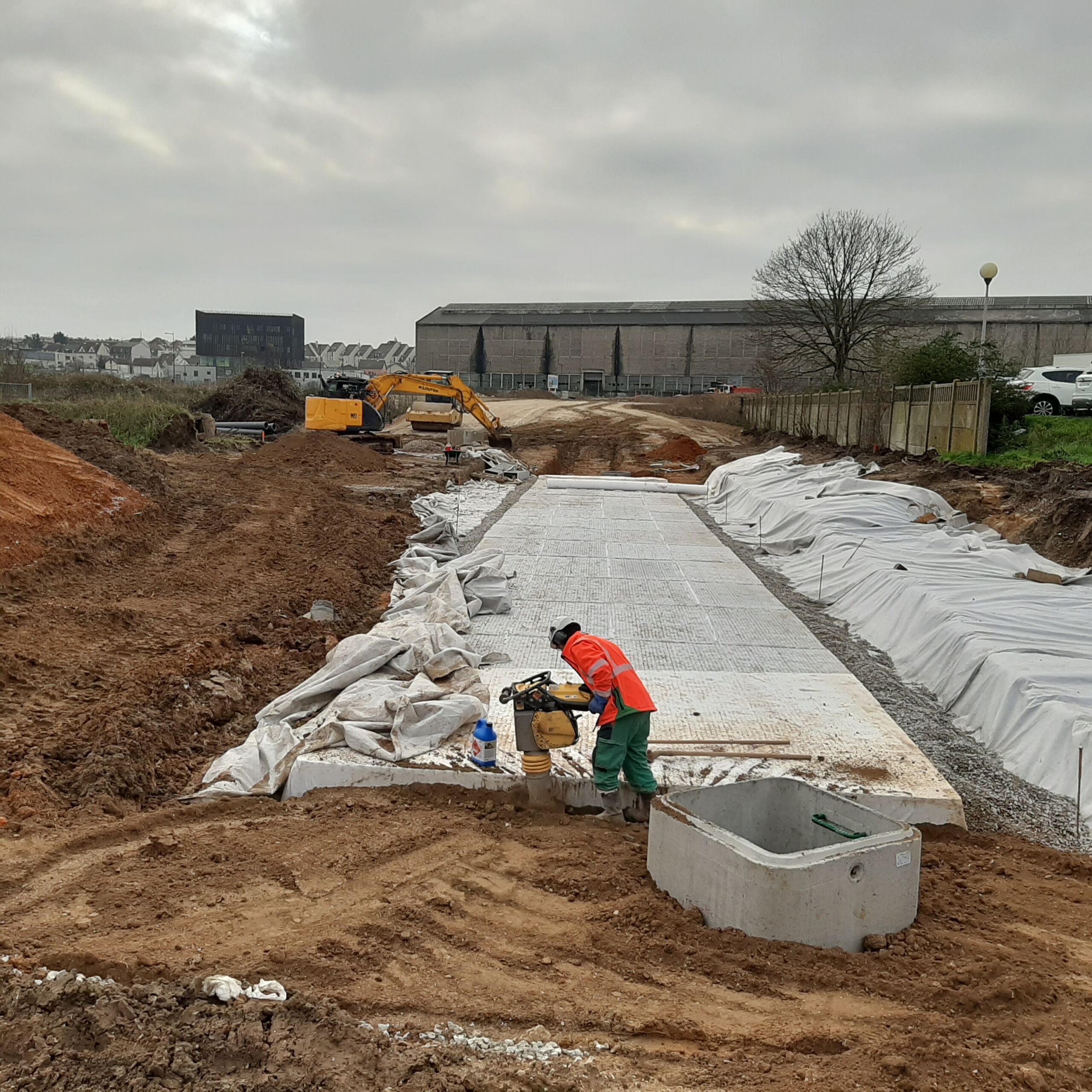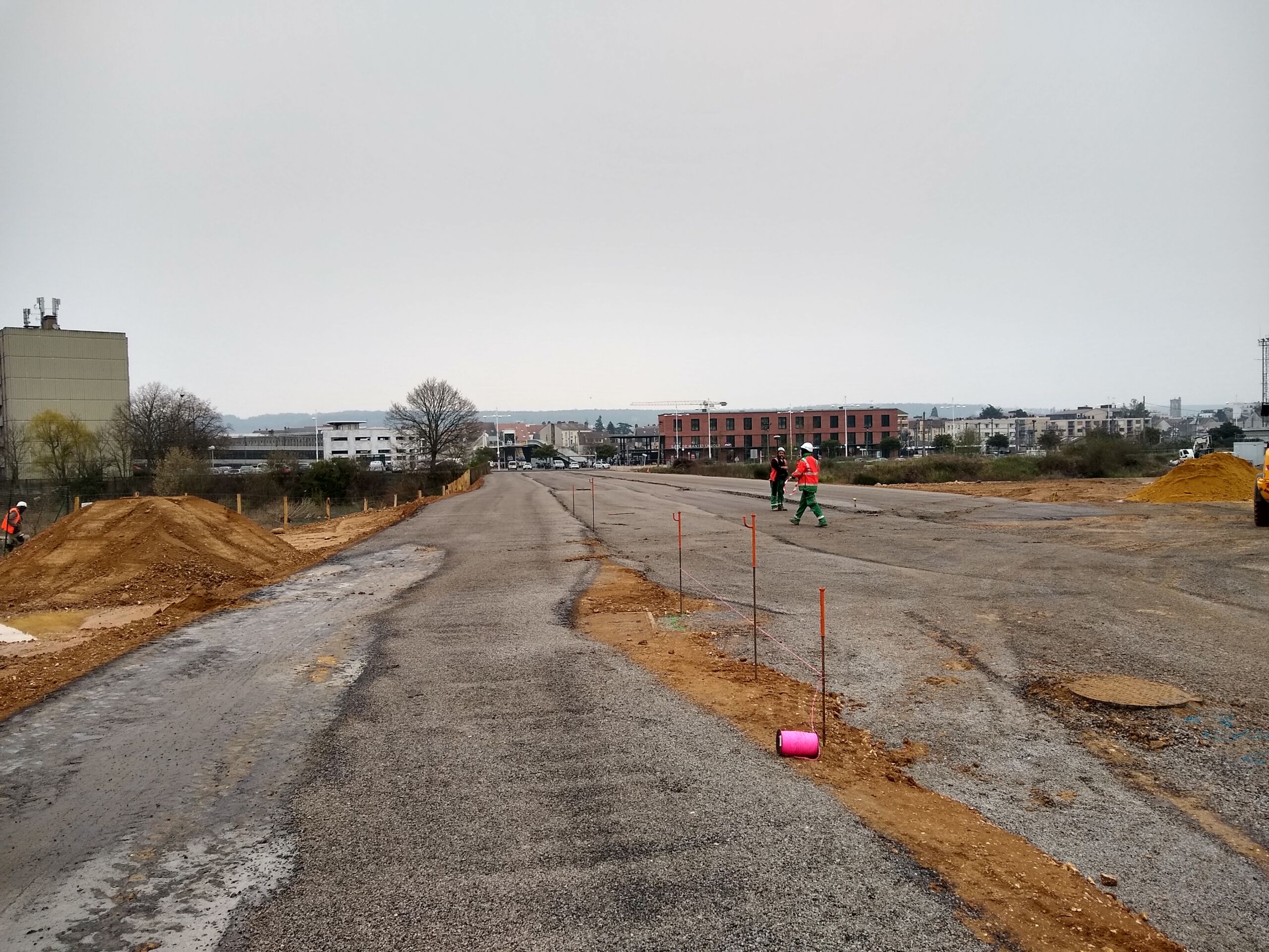 Les équipes créent 3 nouvelles voiries dont une en pavés granit avec joints en émulsion, procèdent au redressement d’un boulevard urbain, posent des bordures granit et réalisent les couches de forme des voiries.